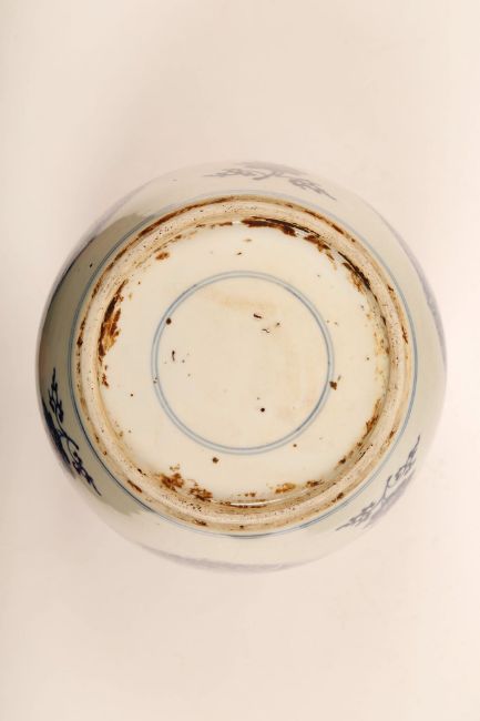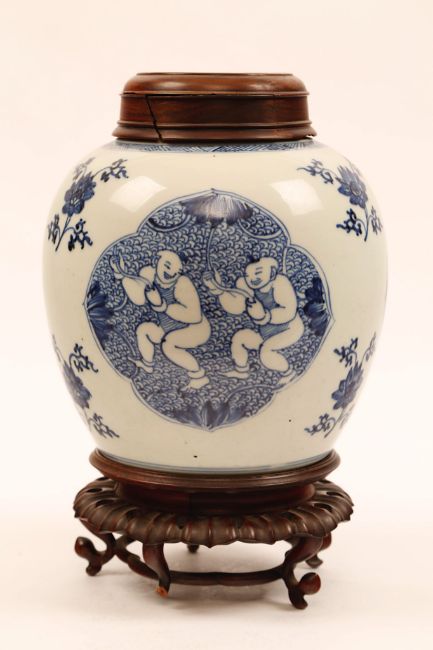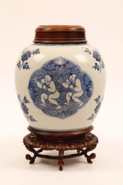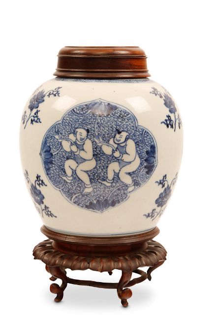 A CHINESE BLUE AND WHITE ‘BOYS’ JAR.Qing Dynasty, Kangxi era. Decorated with quatrefoil panels enclosing boys holding lotus stems, separated by lotus spray, wood cover and stand, 22cm H. (3)???   ???????????????