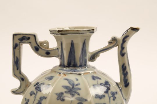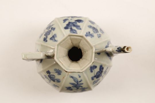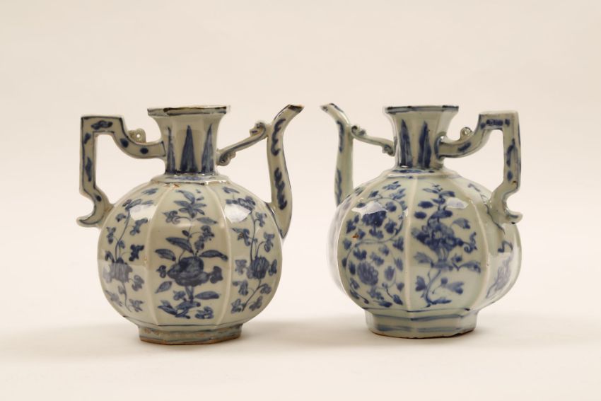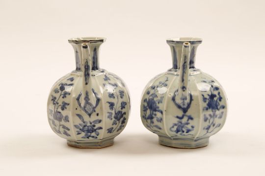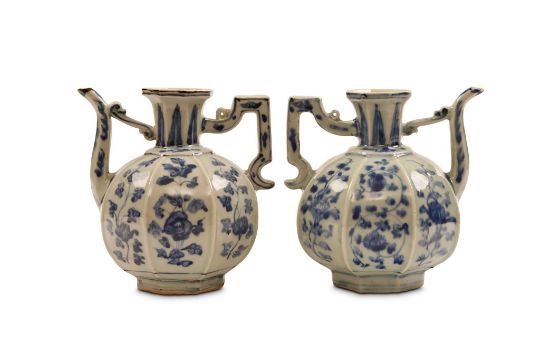 A NEAR PAIR OF CHINESE OCTAGONAL BLUE AND WHITE EWERS. Ming Dynasty, 16th Century. Of octagonal form, the globular body, with floral spray along each face, and set with a curved spout and rectangular handle, the flaring neck decorated with a leaf-lappet band, one ewer with a four character Xuande mark, 16cm H. (2)?????   ???????? For a single ewer see Oriental Ceramics: The World’s Great Collections – Museum of Fine Art , Boston, cat no 88.