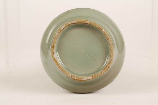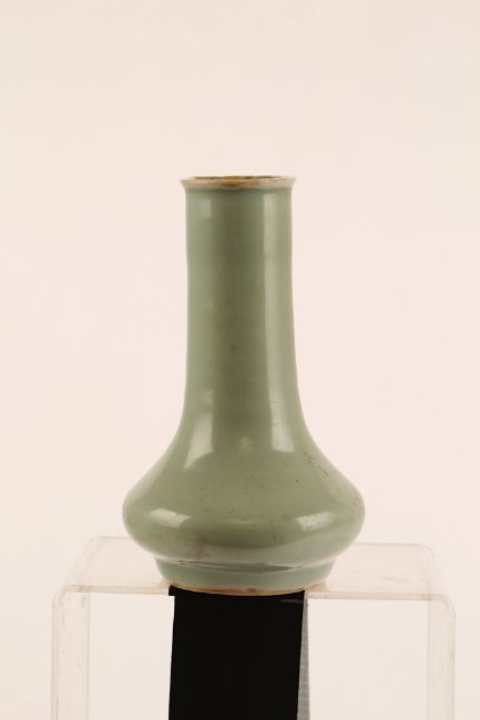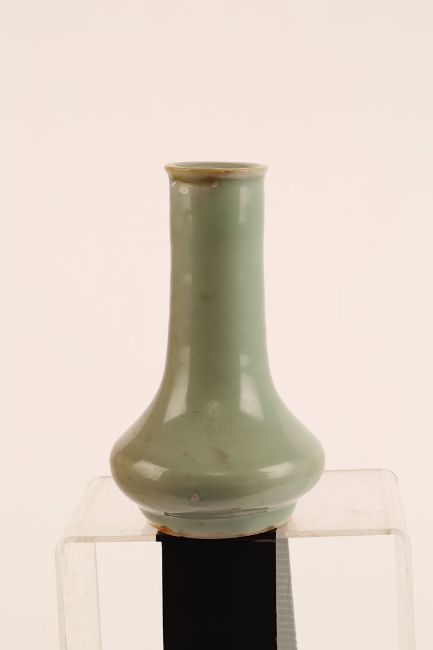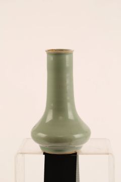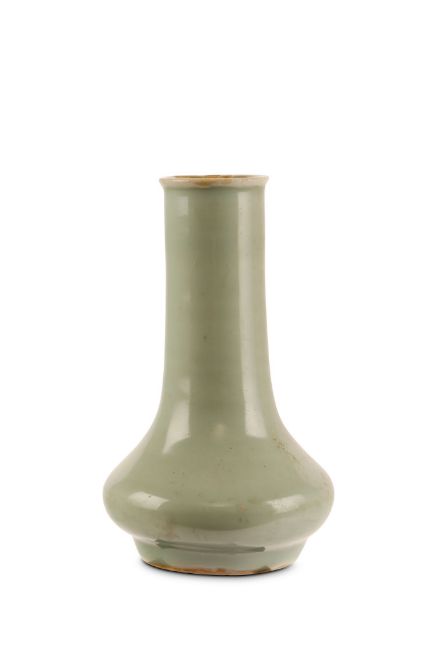 A CHINESE CELADON VASE.Song Dynasty. The pear-shape body rising from a short straight foot to a tall cylindrical neck and everted rim, 15.5cm H.Provenance: from the personal collection of Roger Bluett, thence by descent to the present owner.?   ?????