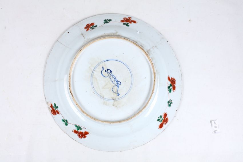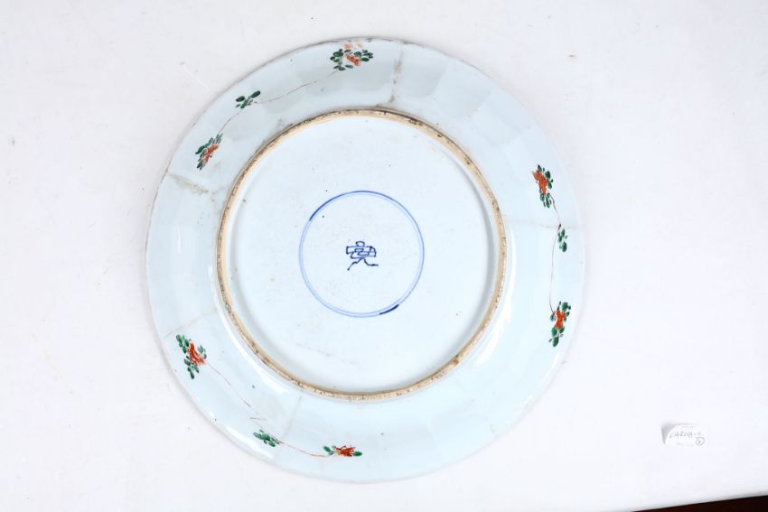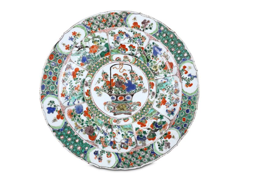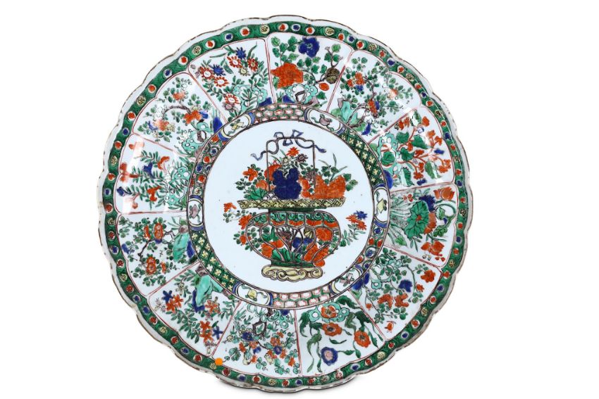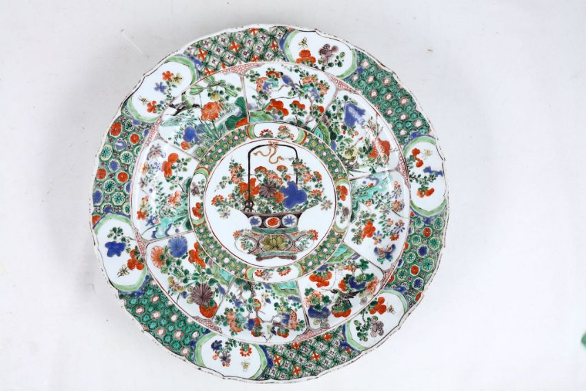 TWO CHINESE FAMILLE VERTE ‘FLOWER BASKET’ CHARGERS. Qing Dynasty, Kangxi era. Each decorated with a central roundel depicting a flower basket, surrounded by lappets of various scenes of flowers and rocks, 37.5cm diameter, 40cm diameter. (2) ???   ????????