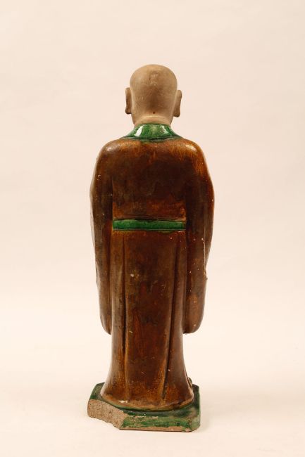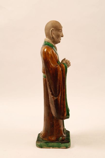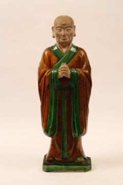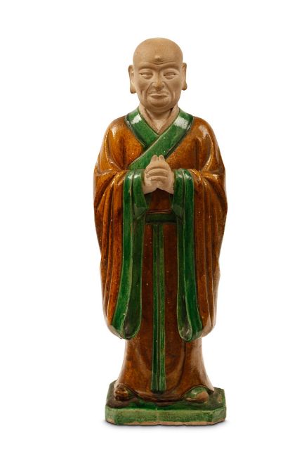 A CHINESE SANCAI-GLAZED MODEL OF A LOHAN.Ming Dynasty.Standing on a low rectangular base in long flowing robes, the hands together, the face, set with an urna, sensitively modeled and bearing a serene, contemplative expression, 56cm H.?   ??????