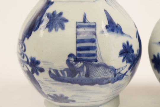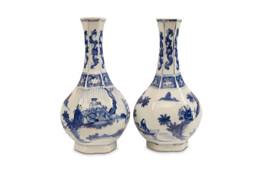 A PAIR OF CHINESE BLUE AND WHITE VASES. Transitional era. Of hexagonal pear-shaped form, decorated to the body with continuous figurative scenes, below floral borders, 27.5cm H. (2) ????   ?????????