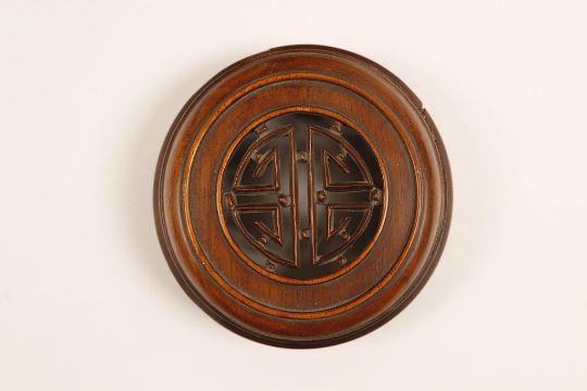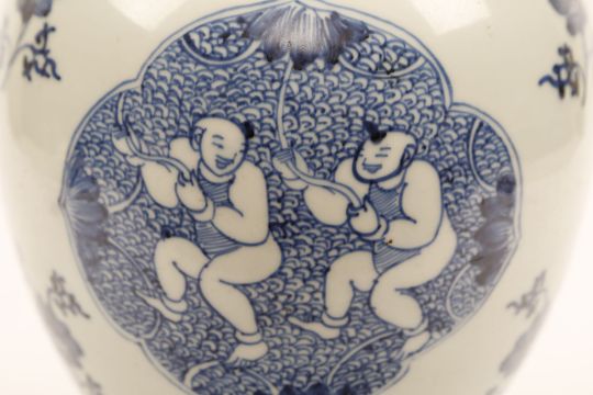 A CHINESE BLUE AND WHITE ‘BOYS’ JAR.Qing Dynasty, Kangxi era. Decorated with quatrefoil panels enclosing boys holding lotus stems, separated by lotus spray, wood cover and stand, 22cm H. (3)???   ???????????????