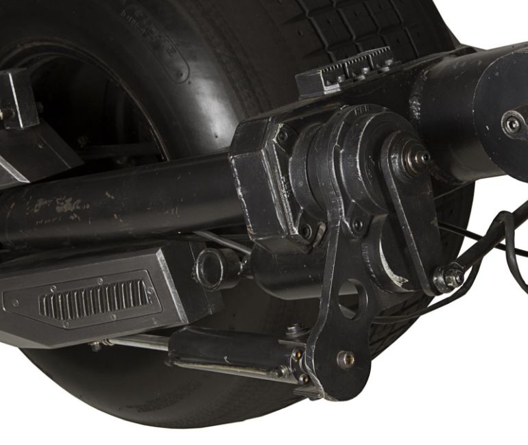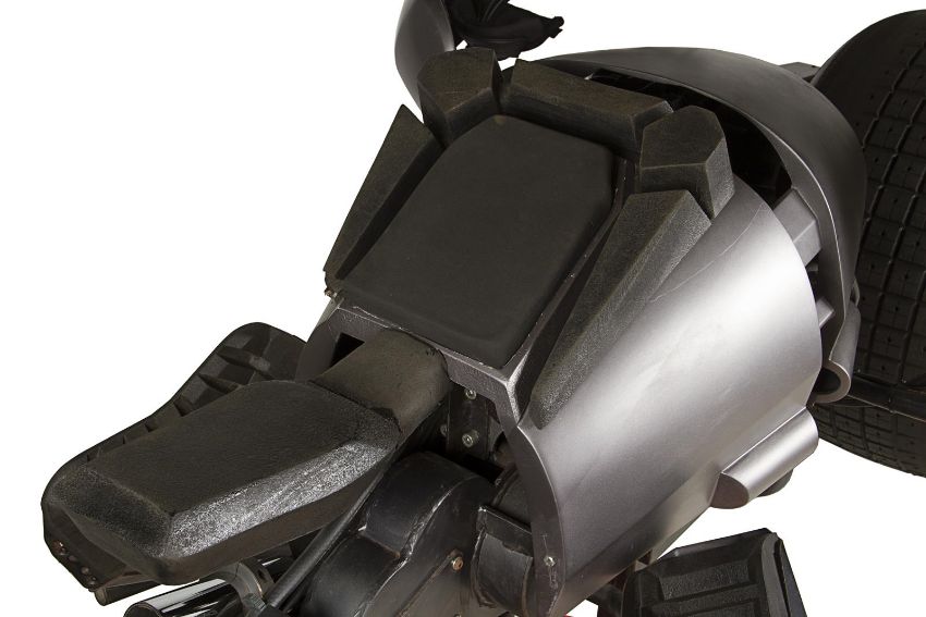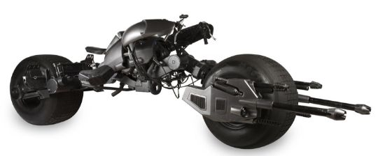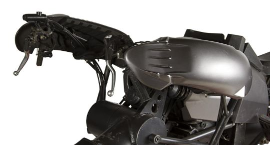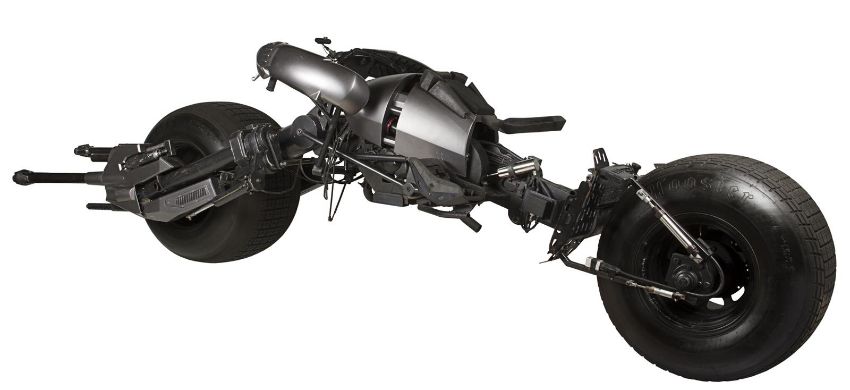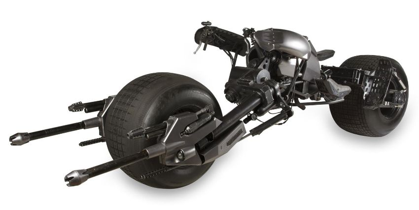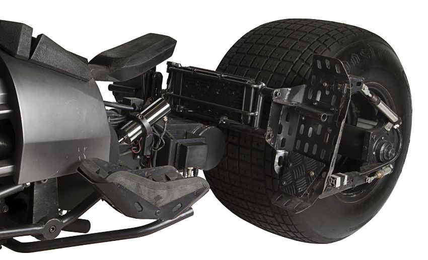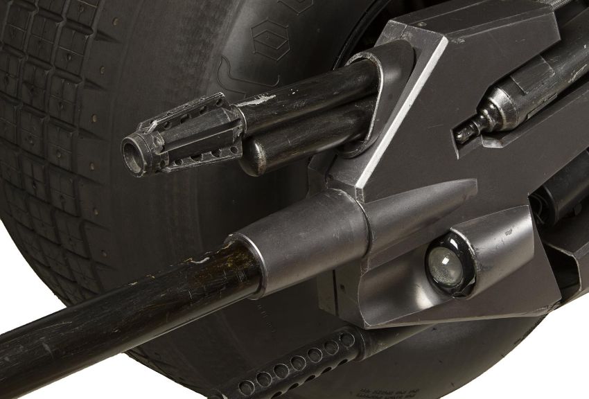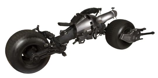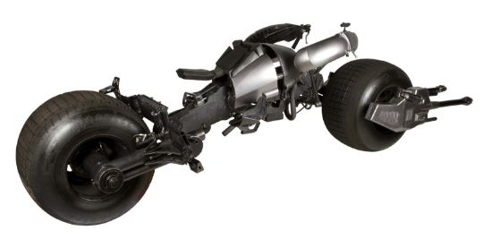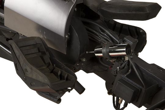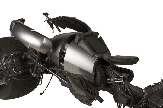 A hero Batpod vehicle from the action films The Dark Knight and The Dark Knight Rises, directed by Christopher Nolan. In The Dark Knight Batman (Christian Bale) used the Batpod to escape his Tumbler vehicle during his battle with the Joker (Heath Ledger), and later used the vehicle in his unsuccessful attempt to save Rachel Dawes (Maggie Gyllenhaal) and in his hunt for Harvey Dent (Aaron Eckhart). In The Dark Knight Rises, Batman and Selina Kyle (Anne Hathaway) used the vehicle during their battles with Bane (Tom Hardy) and the new League of Shadows. Conceived by Christopher Nolan and production designer Nathan Crowley, the Batpod was intended to provide an alternative to Batman’s trusty Tumbler vehicle. The design was created by Crowley and brought to life by special-effects supervisor Chris Corbould, who made six of the vehicles for use on The Dark Knight. The unusual shape of the vehicle made engineering a challenge, especially with such unconventional tires fitted. The unique Pod is designed for a rider in a prone position who steers the vehicle with their arms and shoulders, and features advanced design elements such as an exhaust system integrated within the framework. The vehicles were largely driven by stunt rider Jean-Pierre Goy during filming, and were used for numerous events in the promotion of The Dark Knight and The Dark Knight Rises. Crowley received Academy Award® and BAFTA Award® nominations for his work on The Dark Knight. This incredible vehicle features a custom-made chassis with 31" Hoosier racing tyres and a Honda 750 engine. Fibreglass body panels finished in metallic grey paint cover the bike’s engine and handlebars. A pair of cannon barrels made of plastic, resin and fibreglass are secured at the front of the vehicle, and a laser targeting unit is fitted above the right hand grip. A radiator and hydraulics are fitted behind the saddle, and the braking system is operated by controls on the left handle and the right pedal. Black foam padding is installed on the body, saddle and knee rests for comfort whilst riding. Well-used on both productions, as well as in the promotion of the films as part of the Warner Bros. archive, the Batpod displays some wear to the body panels and some light corrosion on the chassis, with damage to the left gun mount as a result of use on set. However, in spite of this wear, the vehicle remains in very good condition and is supplied with a metal support stand for display purposes. Dimensions: 380 cm x 120 cm x107 cm (149 ½" x 47 ¼" x 42 ¼")This lot is supplied with a Warner Bros. certificate of authenticity in place of a Prop Store certificate. Payment plan on this item is restricted to a duration of one month. Please contact us for further information. This vehicle is sold in non-functional ‘rolling only’ condition. It is drained of all fluids, and the battery, fuel tank and throttle controls have been removed. VAT Status - DAGGER