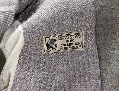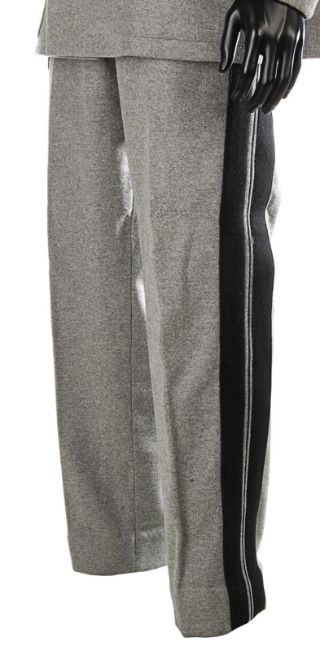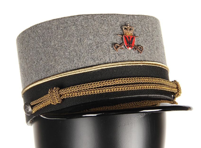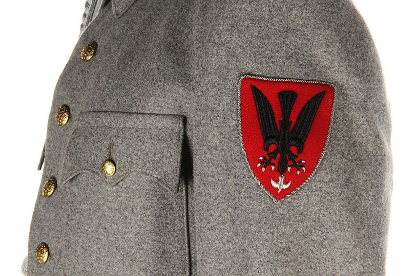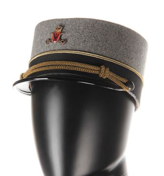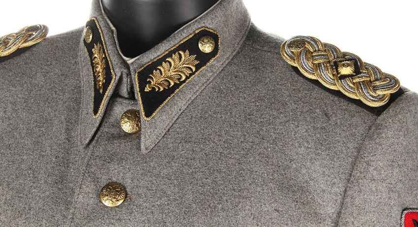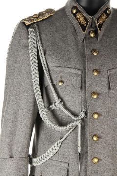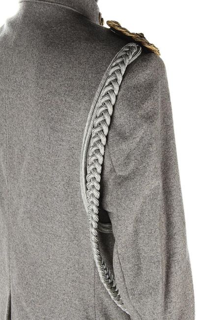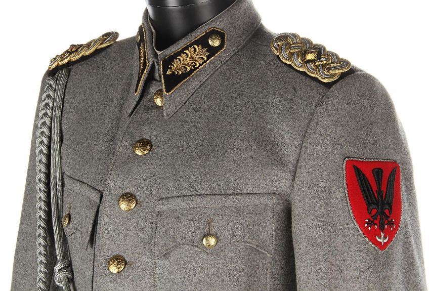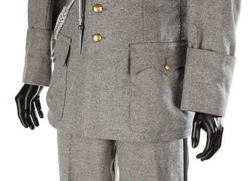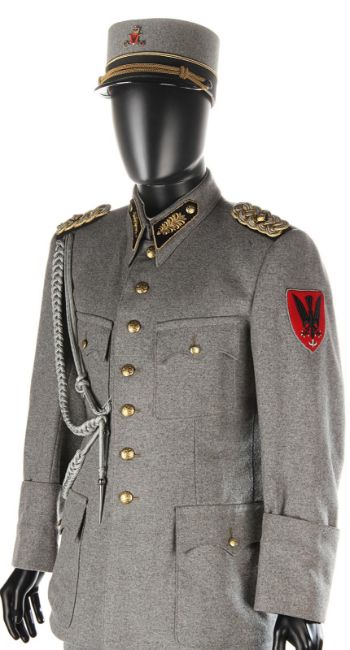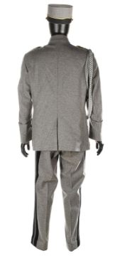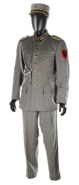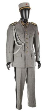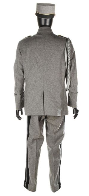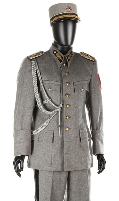 A ZZ Officer uniform from Wes Anderson’s Oscar®-winning comedy The Grand Budapest Hotel. When the Grand Budapest Hotel is commandeered as an army barracks, numbers of the high ranking ZZ officers are seen enjoying the luxurious surroundings. The costume consists of a grey woollen military jacket, trousers with black stripes and a rigid cap. The jacket features faux-silver and faux-gold epaulettes, embroidered collar tabs, faux-silver braids and a red patch on the left arm above a removable black ZZ armband. The grey cap has a black vinyl peak, faux- gold braid and a red shield badge to match the jacket. The jacket is marked size 'W54', the trousers 'W59 x d96' and the cap is marked size '57'. The costume remains in very good condition. VAT Status - DAGGER TRIANGLE