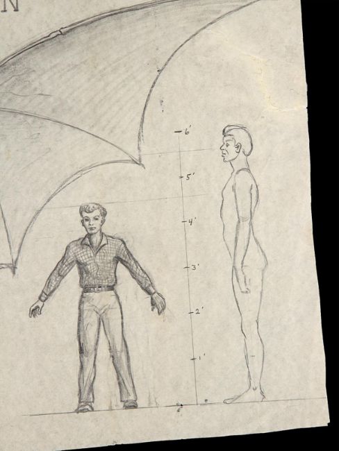 A hand-drawn sketch for a pterodactylus (or pterodactyl) from Jim O’Connolly’s sci-fi western The Valley of the Gwangi. This image shows a pterodactyl in front view revealing its full wingspan, along with a human figure scaled at 6 feet. Harryhausen made detailed size comparisons as a matter of routine as they were vital for his own reference, as well as that of the actors to help them visualise the true height of Harryhausen's creations. Titled Pterodactylus – Pteranodon, this represents the final, most detailed version of the drawing. It is in good condition after undergoing professional restoration. Originally on two pages, the original tape has been removed and the join remade. A tear to the right side has also been expertly repaired. Dimensions: 38 cm x 79.5 cm (15" x 31")Please note this lot is sold without copyright, reproduction rights, licensing agreements or any other type of legal release. VAT Status - Margin TRIANGLE