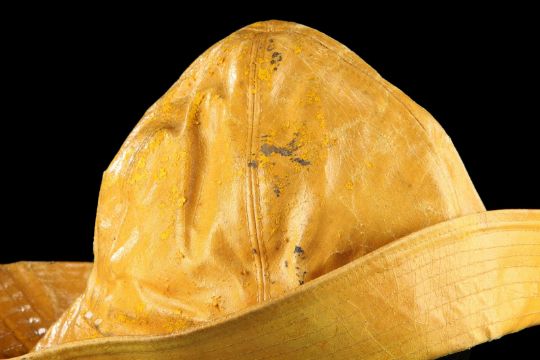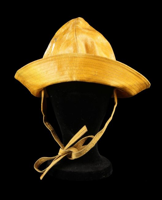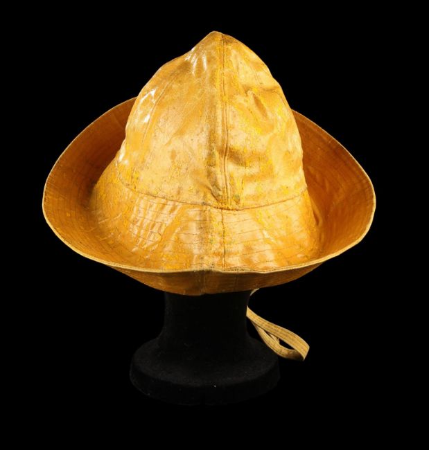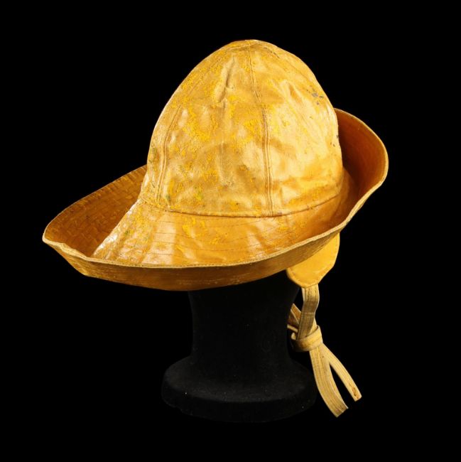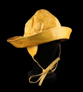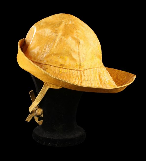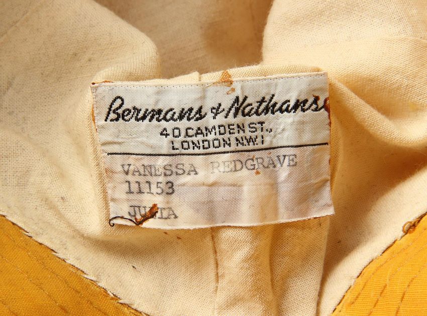 Julia’s (Vanessa Redgrave) rain hat from Fred Zinnemann’s Academy Award®-winning drama Julia. Julia wore her rain hat during the scenes in which she and Lillian (Jane Fonda) ventured out on a sailing boat. The yellow fisherman’s hat is made from PVC coated polyester, with two yellow straps and a white cotton lining. A Bermans and Nathans costumiers label is located in the hat’s lining, which reads 'Vanessa Redgrave 11153 Julia'. The hat has been covered with yellow paint which is flaking from age and it shows minor stains and wear. VAT Status - DAGGER