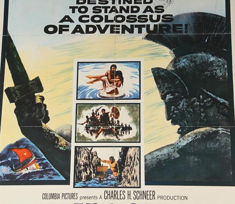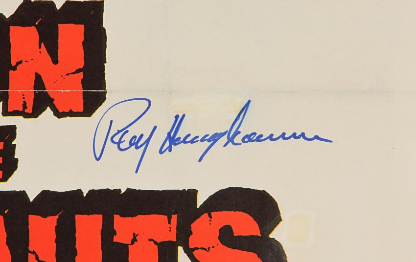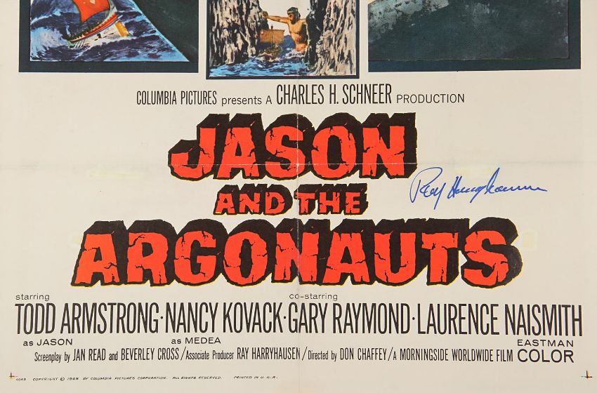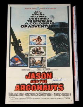 A one-sheet poster (G folded condition with tears and wear on the creases and a stain in the top left corner) from the Don Chaffey fantasy-adventure Jason and the Argonauts. This untrimmed, linen-backed vintage poster is autographed by Ray Harryhausen in blue marker amidst the movie title on the right. Dimensions: 69 cm x 105 cm (27" x 41 ½") VAT Status - Margin