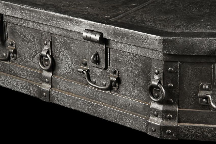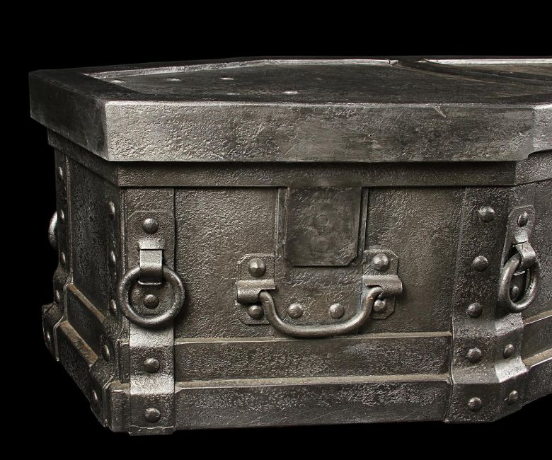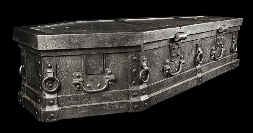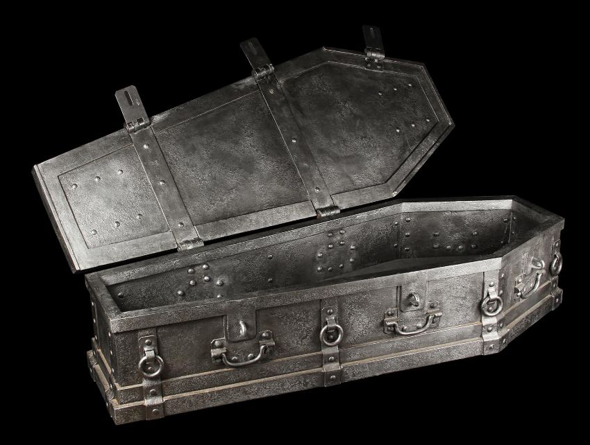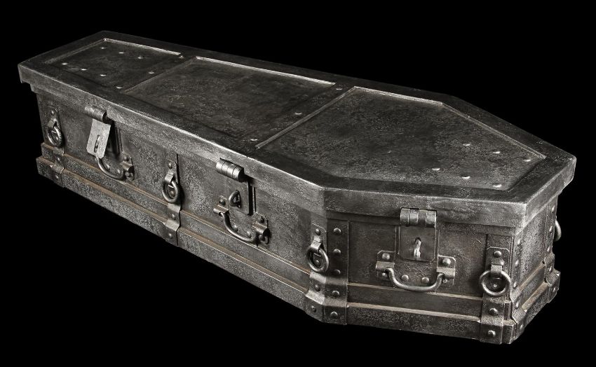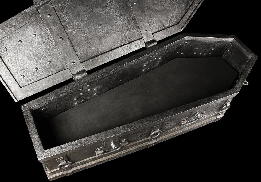 Barnabas Collins' (Johnny Depp) coffin from the comedy Dark Shadows, directed by Tim Burton. After being inadvertently released in 1972,Collins is once again imprisoned by witch Angelique (Eva Green) after rejecting her numerous seductive advances. The large gothic piece is constructed from fibreglass with details including braces and rivets cast into the form. The lid, also fibreglass, opens via a set of large metal hinges and has corresponding latches on the opposite edge with a number of metal hoops and brackets along the centre of the side panels. The inside is decorated to match the exterior, with several layers of black foam lining the base for the performer’s comfort. The coffin is stored inside the original wooden production transport crate, which includes the movie title stencilled in paint on the sides. Dimensions: (crate) 218 cm x 86 cm x 89 cm (85 ¾" x 35" x 33 ¾")This lot is supplied with a Warner Bros. certificate of authenticity in place of a Prop Store certificate. Payment plan on this item is restricted to a duration of one month. Please contact us for further information. VAT Status - DAGGER