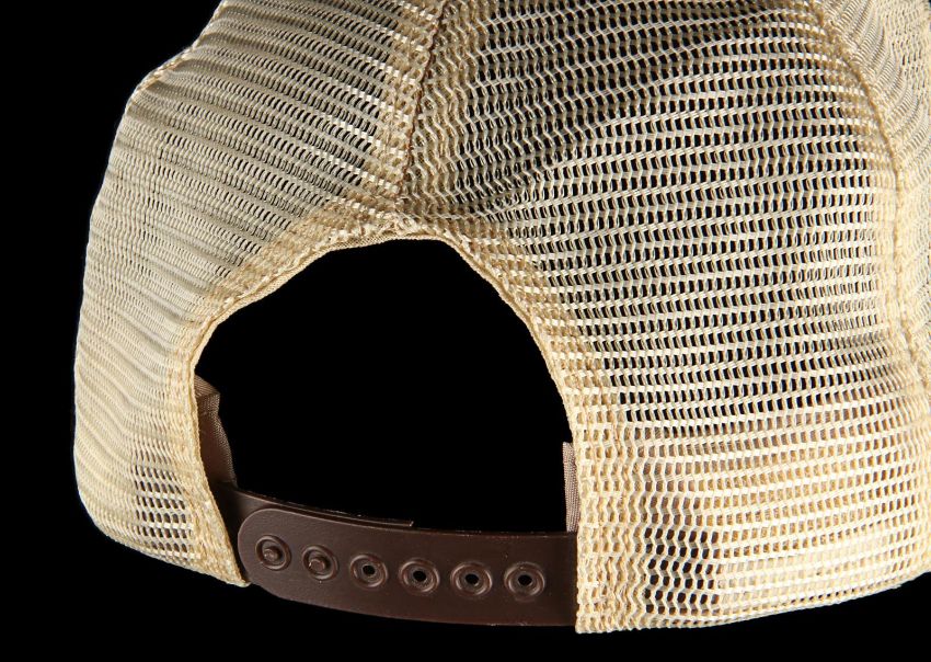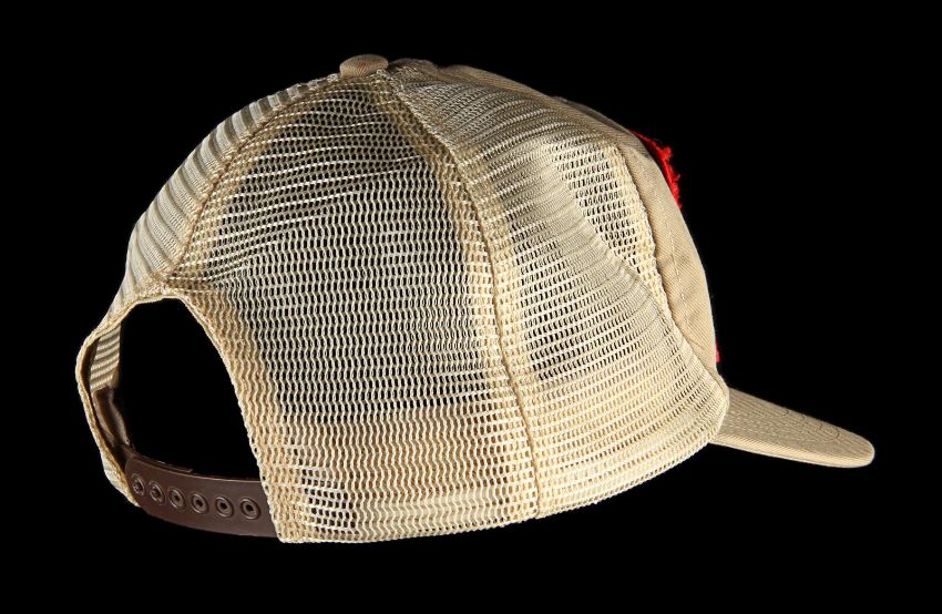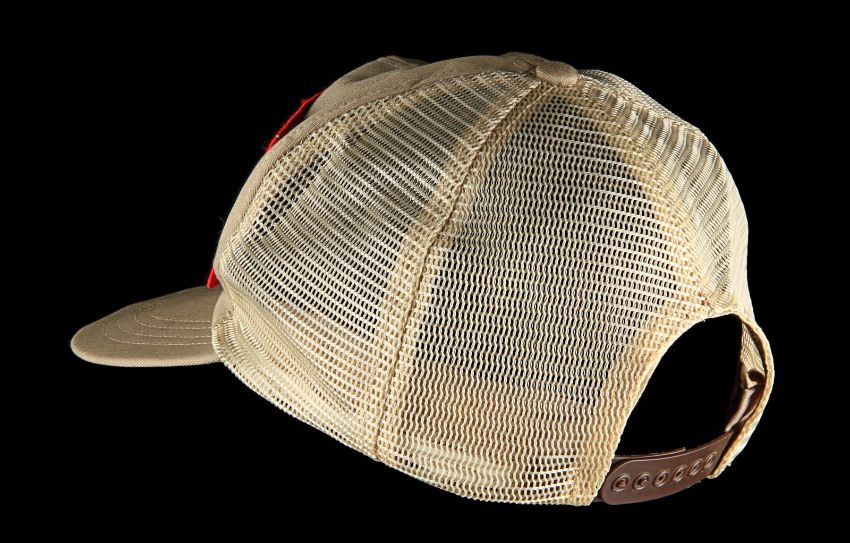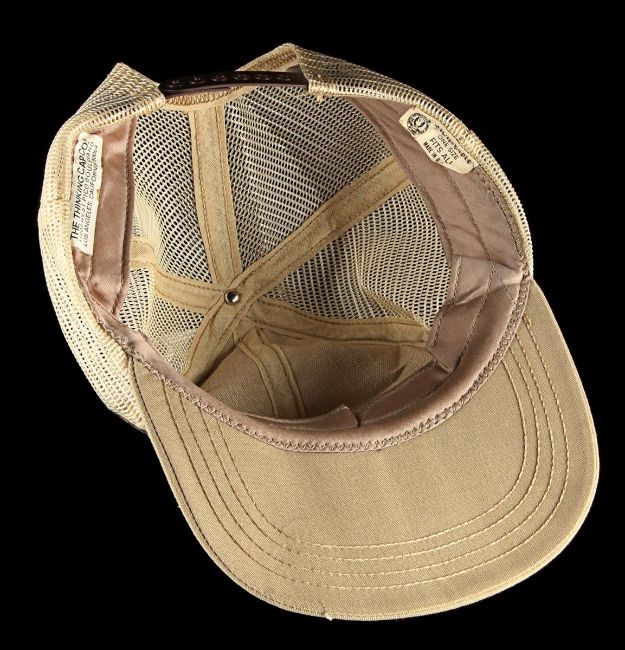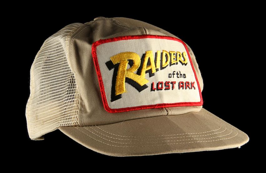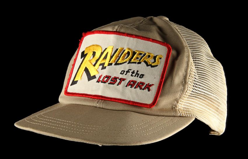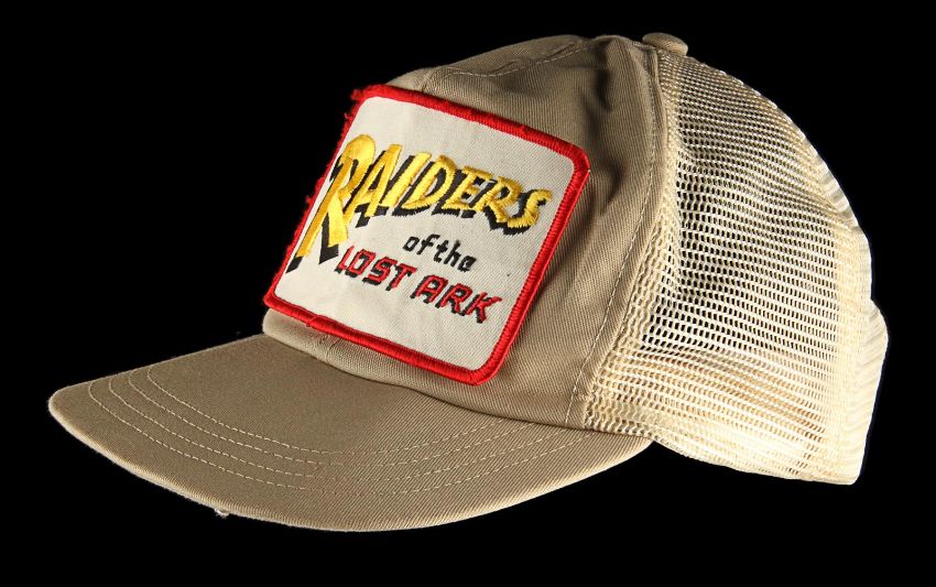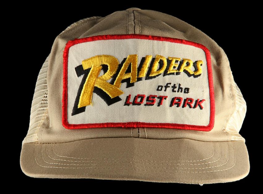 A production crew cap from Steven Spielberg’s action-adventure classic Raiders of the Lost Ark. These caps were given to crew members who worked on the film and can be seen in a well-known behind-the-scenes still of Spielberg as he looked over an art department set model. This incredibly rare hat was custom-made by The Thinking Cap Co and displays an embroidered “Raiders of the Lost Ark" patch using the Indiana Jones font in yellow, red and black. It is made from beige fabric and cream mesh, and includes an adjustable brown plastic sizing band. The cap shows some wear with plucked threads around the edge of the patch, and a broken end on the sizing band. VAT Status - Margin TRIANGLE
