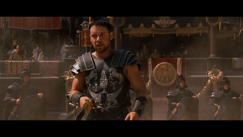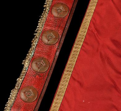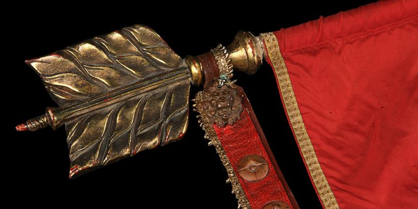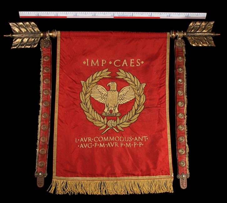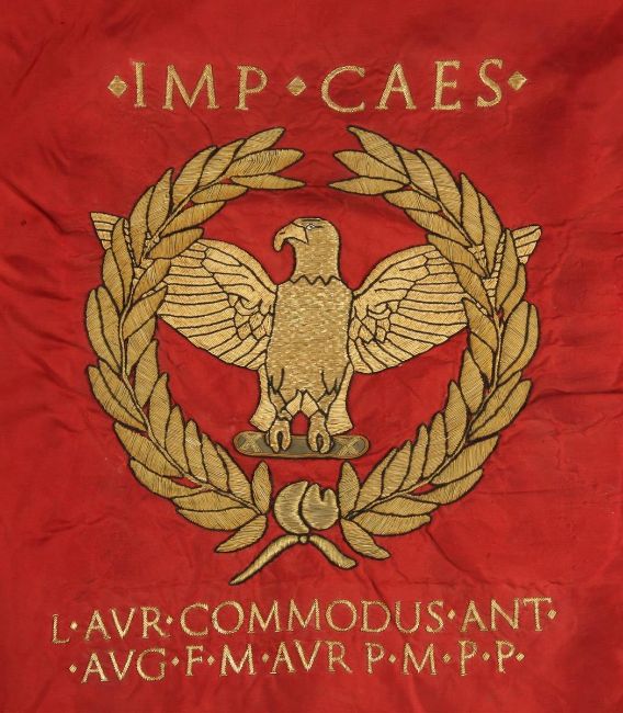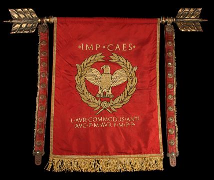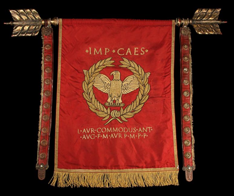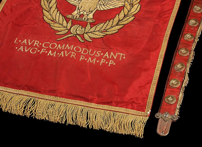 A Colosseum royal box banner from Ridley Scott’s Oscar®-winning action epic Gladiator. Banners were displayed each end of Commodus’ (Joaquin Phoenix) royal box in the Colosseum, most notably during the climactic scenes of the film as Maximus (Russell Crowe) fought the Emperor in the arena. The red banner features faux-gold tassels and embroidery, including an eagle insignia, edging details and Latin abbreviations. It hangs on a metal crossbar with painted faux-gold resin detail on both ends. Two red leather straps hang either side, with faux-gold tasselled edges and bronze-coloured metal rivets. The banner displays some wear due to age and production use, including paint chipping, small tears and edging coming adrift. Dimensions: 5 cm x 84 cm x 114 cm(2" x 33" x 45") VAT Status - Margin TRIANGLE