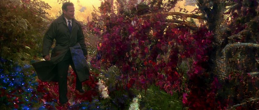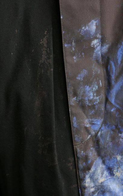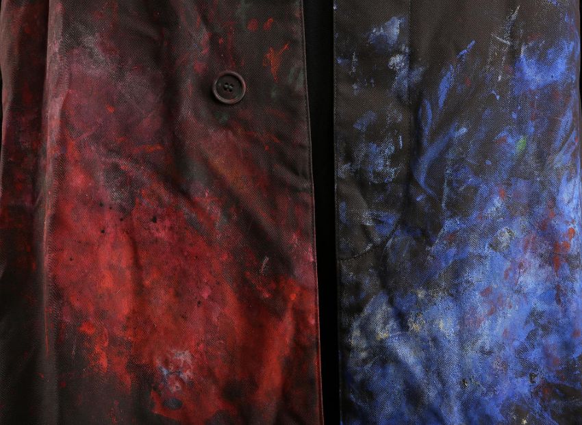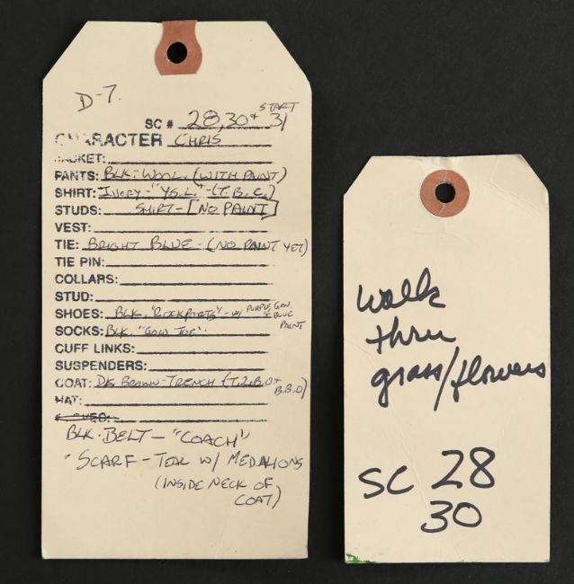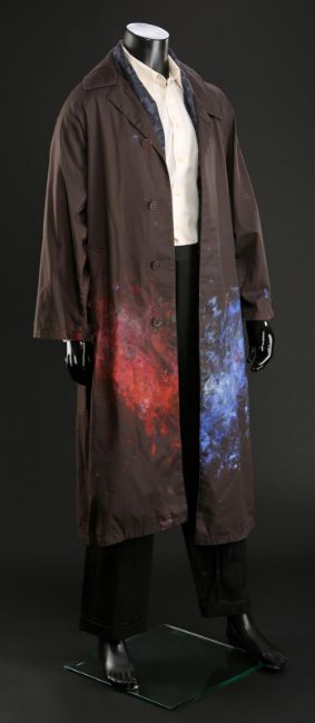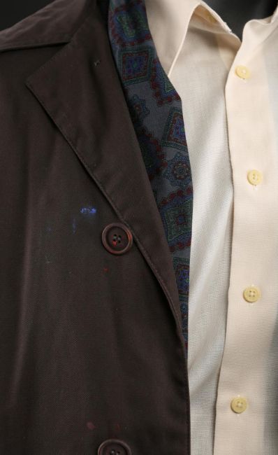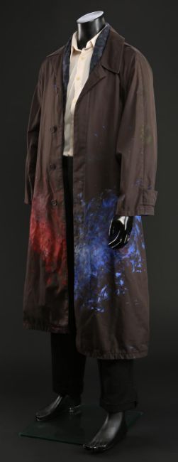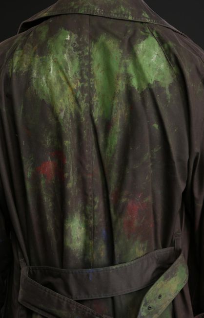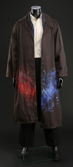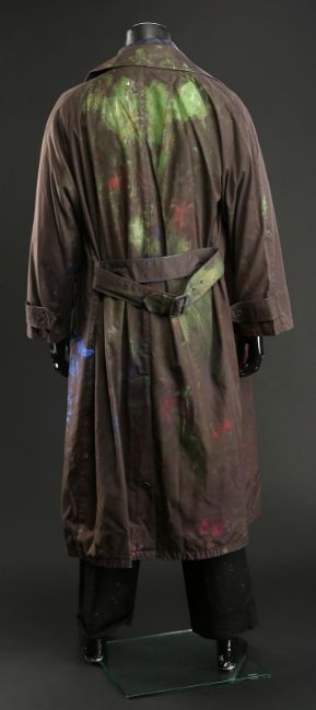 Chris' (Robin Williams) paint-splattered costume from director Vincent Ward's What Dreams May Come. After dying in a tragic accident, Chris awoke in his own version of heaven created from his imagination. This outfit screen matches to the scene when Chris walks through painted flowers and observes his new world from a hill. This outfit includes a bespoke trench coat, Yves Saint Laurent dress shirt, scarf, and Brooks Brothers pants. The entire ensemble has been splattered in paint and the scarf is taped inside the trench coat. Paired with the costume are two wardrobe tags which note its use in scenes 28 and 30. The costume shows minor wear due to production use and age, but remains in very good condition. VAT Status - OMEGA