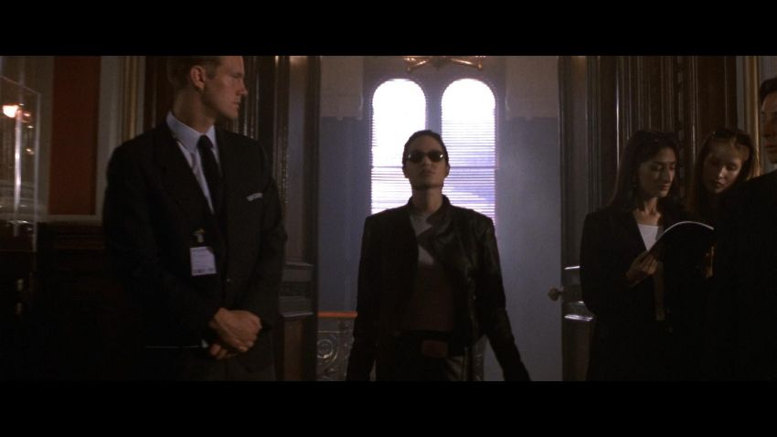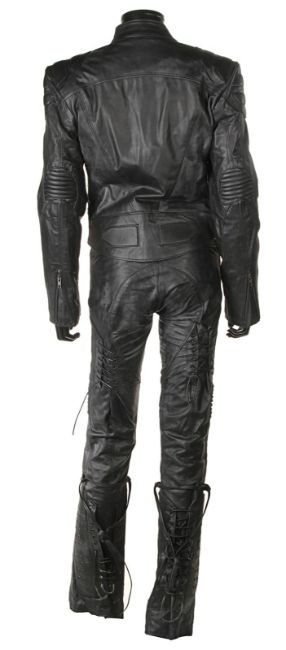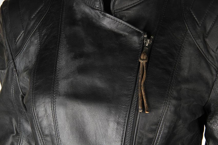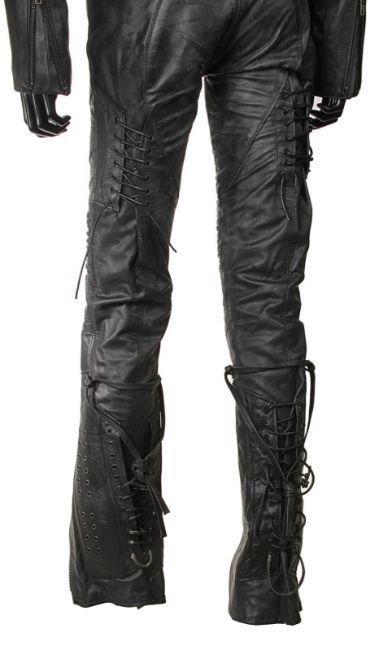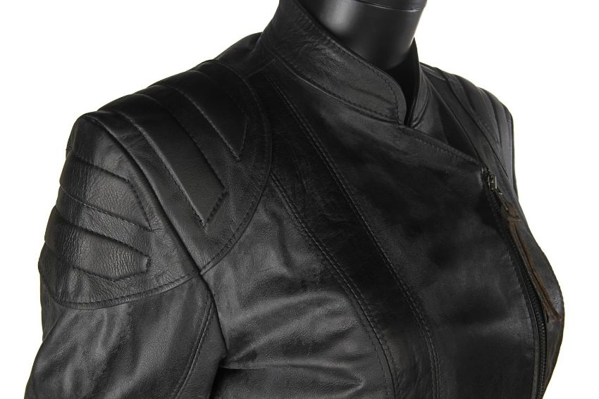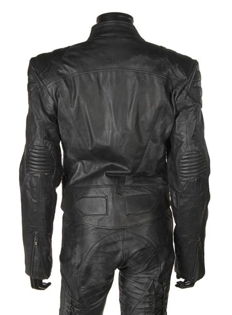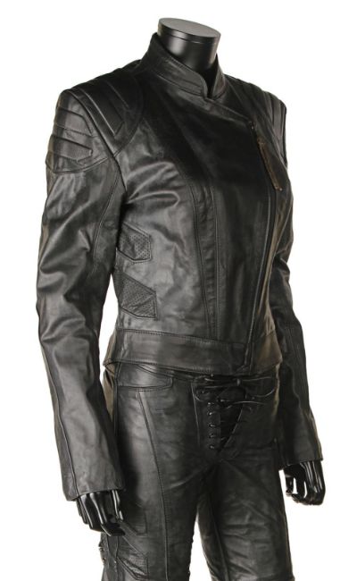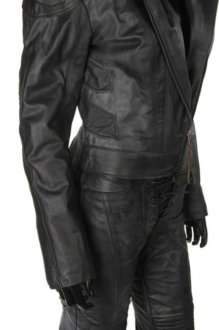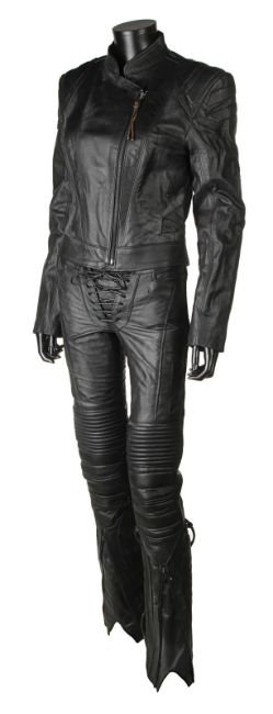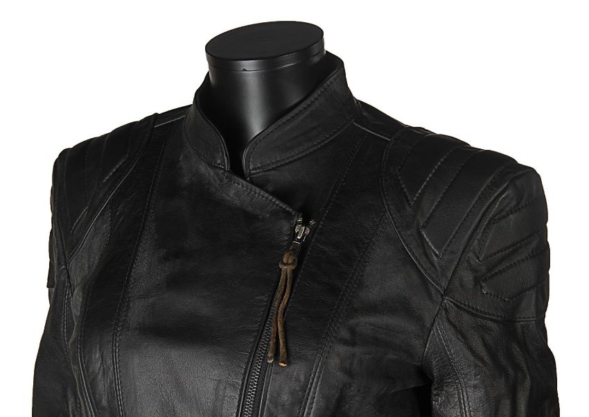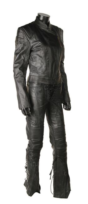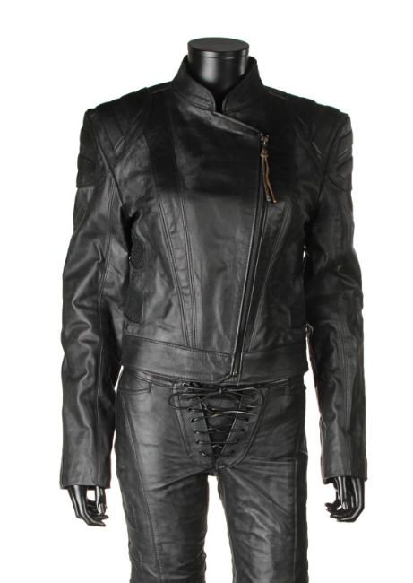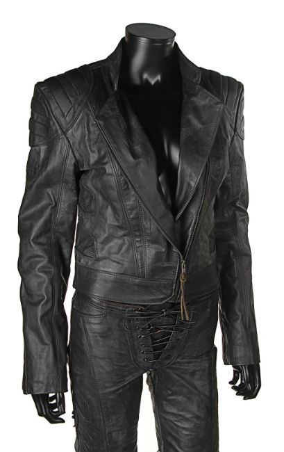 Lara Croft’s (Angelina Jolie) motorcycle costume from Simon West’s action-adventure Lara Croft: Tomb Raider. Croft wore her black motorcycle leathers during scenes at the auction house where she visits her old friend Wilson (Leslie Phillips) for information about the mysterious clock device. The custom-made costume consists of a black leather zip-up jacket, with black leather trousers. The jacket features shoulder and elbow padding, with adjustable zips at the end of either sleeve. A brown leather cord is tied to the centre zip head. The trousers are fastened at the front by leather laces, with two sets of matching laces on either leg. The garment has padded knees, black metal decorative studs and adjustable zips at the end of each leg. The interior of the trousers is lined with navy mesh. Signs of production use are evident, including worn leather on the laces. VAT Status - Margin