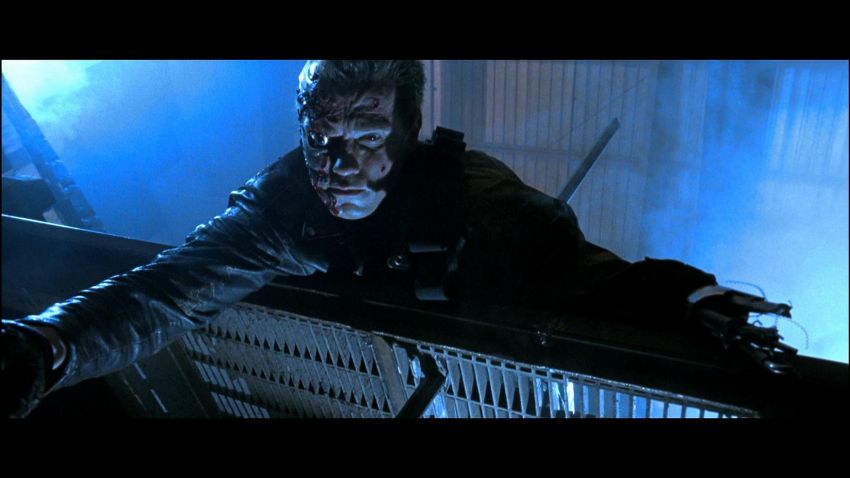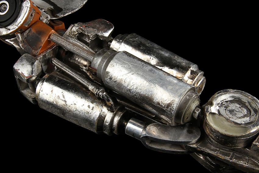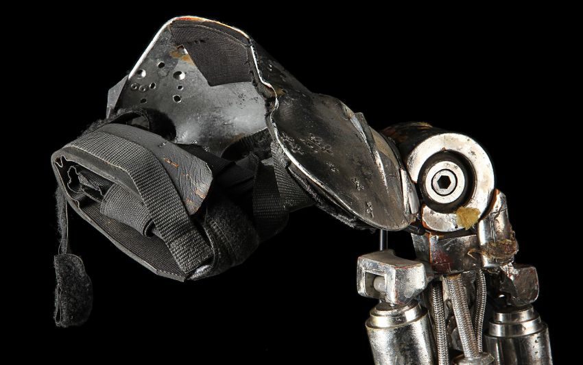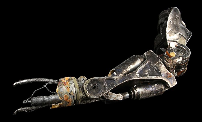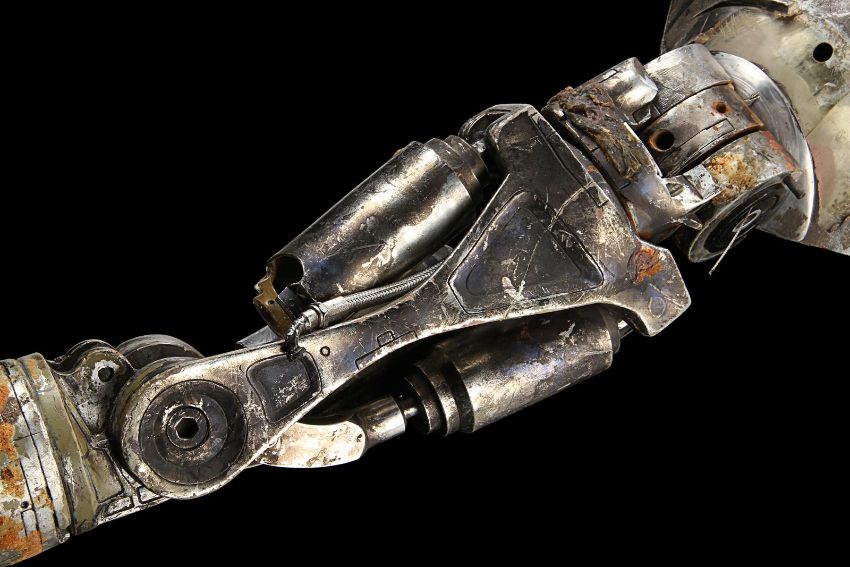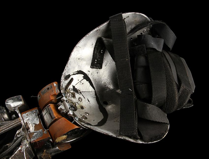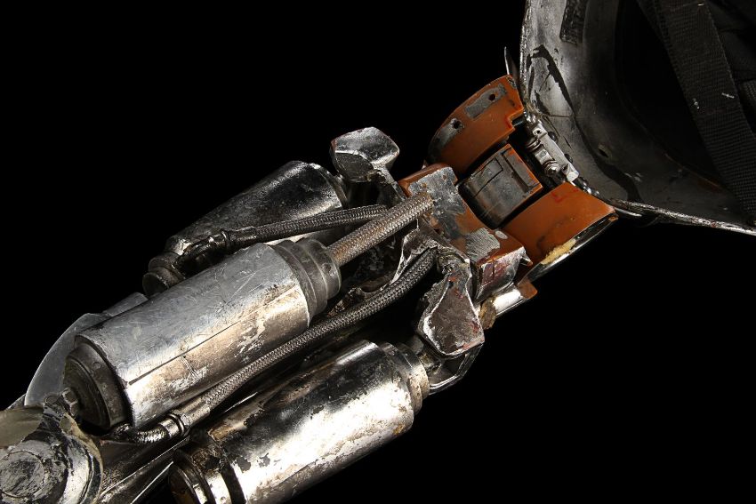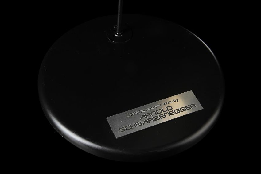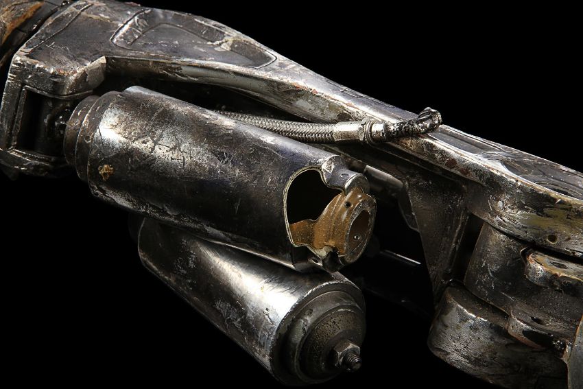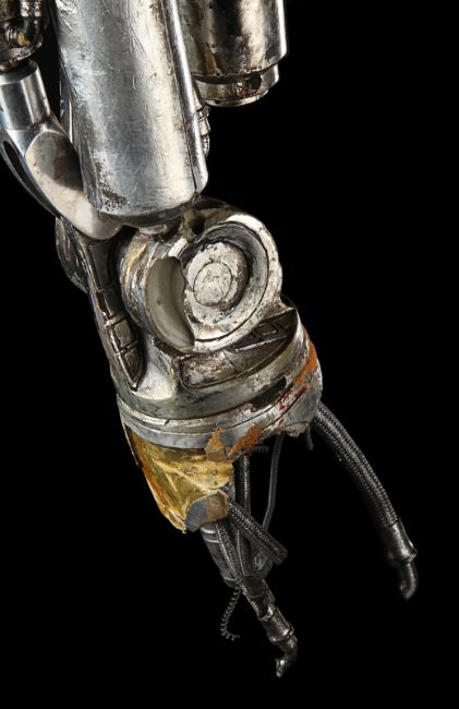 The Terminator’s (Arnold Schwarzenegger) battle-damaged arm from James Cameron’s sci-fi action film Terminator 2:Judgment Day. During the final fight with the T-1000 (Robert Patrick), the Terminator trapped his arm in a cog mechanism at the steel mill, leaving it in an exposed endoskeleton state. The arm consists of a shoulder plate with faux-silver components made to resemble hydraulics and tubes. The appliance is strapped to the performer’s shoulder with Velcro and synthetic webbing. It is made from various materials including vacuum-formed plastic on the shoulder plate, metal springs, fibreglass joints and foam pipes. The arm displays residue on the mechanics to replicate the look of torn flesh. It shows wear throughout, including missing sections on the shoulder and joints, and detached pipes. The piece is displayed on a custom-made stand. Dimensions (displayed):28 cm x 38 cm x 74 cm (11" x 15" x 29") VAT Status - Margin