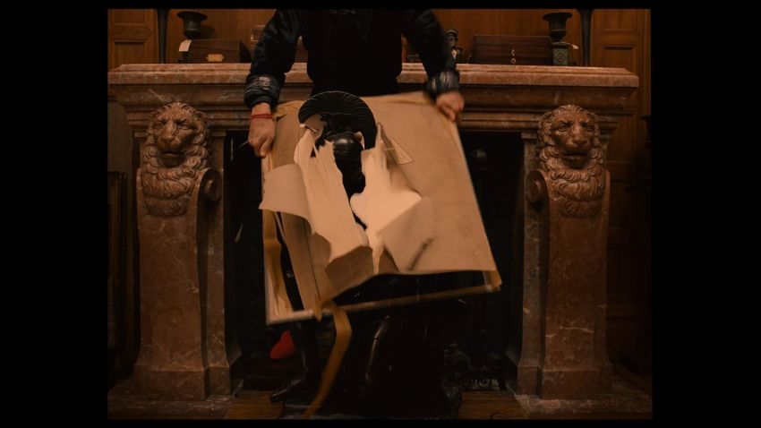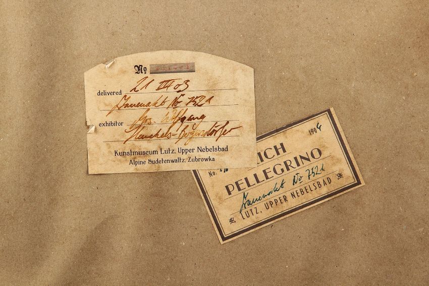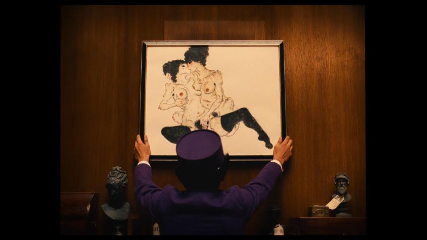 A painting of two nudes kissing from the Wes Anderson's Oscar®-winning comedy The Grand Budapest Hotel. Zero (Tony Revolori) and Gustave (Ralph Fiennes) used the controversial painting as a decoy to replace ‘Boy with Apple’ when they liberated the masterpiece following the reading of Madame D’s (Tilda Swinton) will. The colourful artwork is printed on white paper backed on wooden board, and is a reproduction of an original painting created by artist Rich Pellegrino – in the style of Egon Schiele – specifically for the movie. Several prints were made during production, a distressed Dmitri (Adrien Brody) smashing the artwork up in anger upon realising he had been duped. The back of the board features two aged labels, one with the artist’s name, the other detailing a fictional loan to a museum. Overall, it is in excellent condition. Dimensions: 69 cm x 57 cm (27" x 22 ½") VAT Status - Margin TRIANGLE