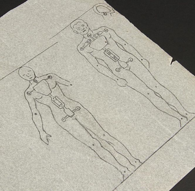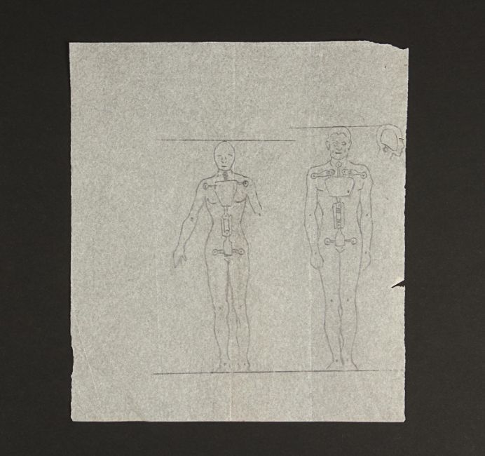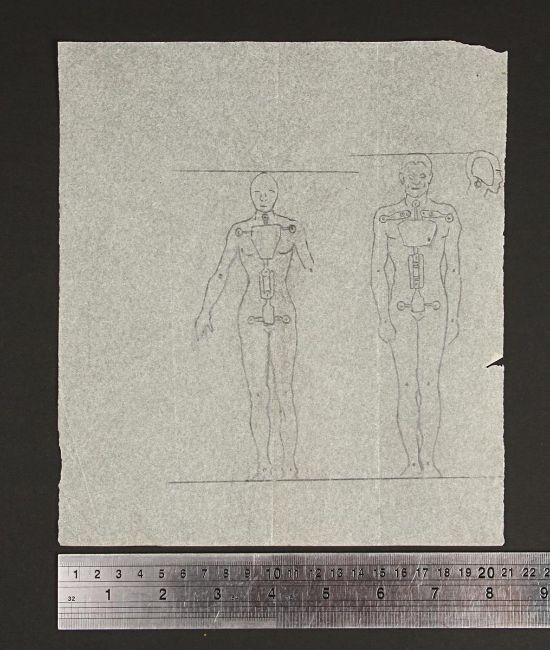 A hand-drawn armature diagram for unidentified male and female figures. After creating the initial look of a creature or character, a significant part of Ray Harryhausen’s design work focused on the physical creation of the puppets. The first step was to design the internal armature. The artwork is rendered in pencil on paper vellum. Dimensions: 21 cm x 23.5 cm (8 ¼" x 9 ¼")Similar drawings of armatures feature on pages 15, 54 and 108 of The Art of Ray Harryhausen by Ray Harryhausen and Tony Dalton, published by Aurum. Please note this lot is sold without copyright, reproduction rights, licensing agreements or any other type of legal release. VAT Status - Margin TRIANGLE