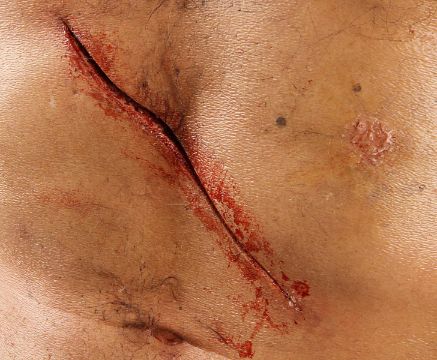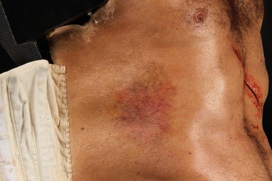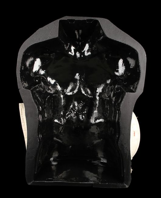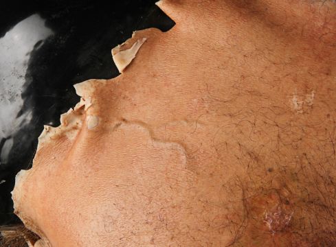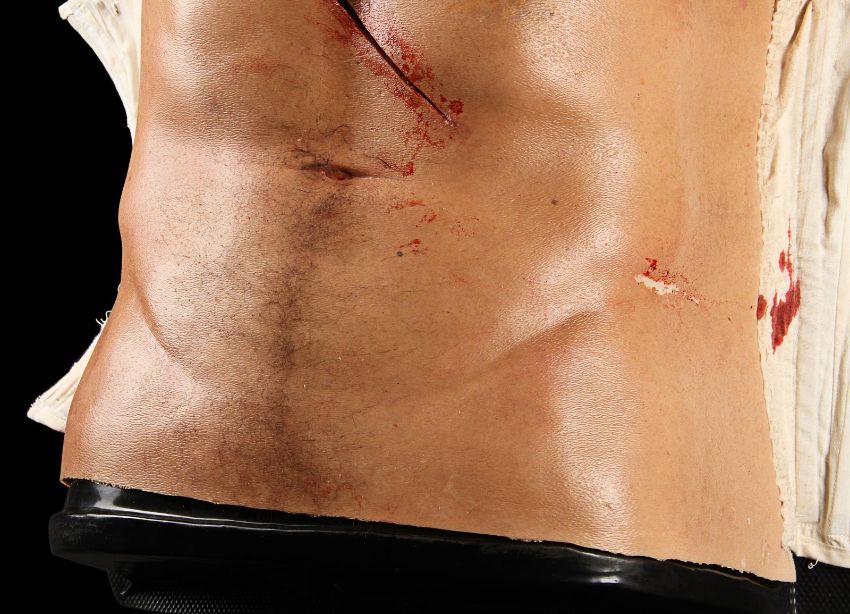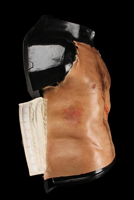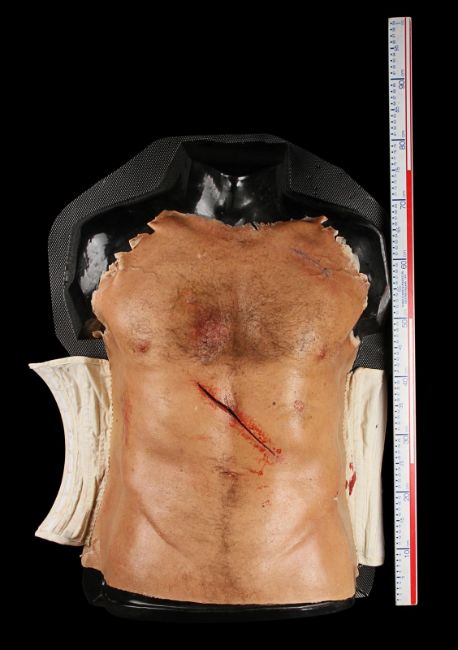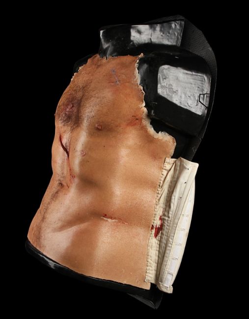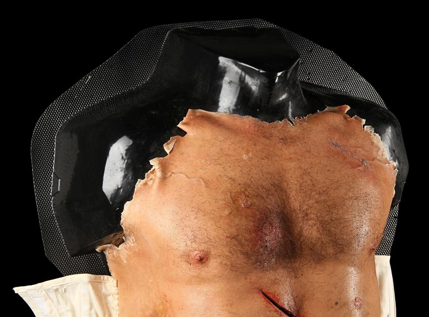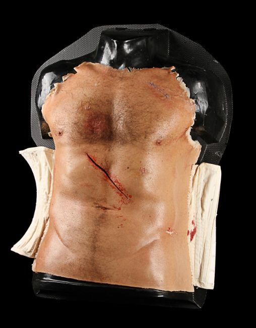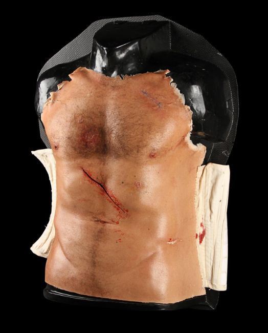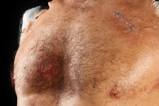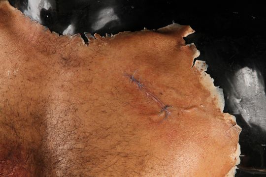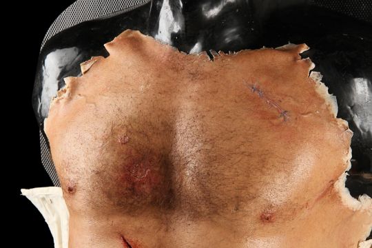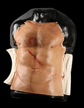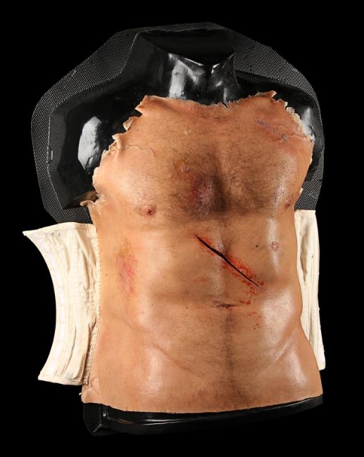 Wolverine's (Hugh Jackman) prosthetic chest appliance from the James Mangold superhero prequel The Wolverine. The chest appliance was worn by Hugh Jackman when Wolverine cut open his chest to remove a robotic parasite attached to his heart, suppressing his healing ability. The chest is made of silicone, featuring hand punched hair and partially healed wounds, including a bullet wound and a cut displaying crude blue stitches. The deep wound from the scene in which the appliance is worn is present in the centre of the chest and is surrounded by fake blood. The appliance has been sewn onto a corset allowing it to sit tight on the actor’s body and is presented on a plastic buck. Dimensions: 82 cm x 61 cm x 26 cm (32 ¼" x 24" x 10 ¼") VAT Status - Margin TRIANGLE