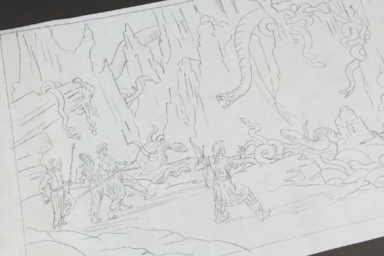A hand-drawn concept sketch showing the Valley of the Vipers from the Gordon Hessler fantasy film The Golden Voyage of Sinbad. This image shows Sinbad (John Phillip Law) and his party navigating their way past a group of giant reptiles, which are creeping towards them along the sides of the canyon. Harryhausen stated that snakes were among his favourite creations, their movements lending themselves well to his animating process. The scene was ultimately dropped from the screenplay before production. This image is drawn in pencil on vellum paper. The edges are irregularly cut and show minor wear and folds from age, however overall the piece remains in good condition. Dimensions: 33 cm x 54 cm (13" x 21 ΒΌ") The final, key art version of this image features on page 218 of Ray Harryhausen: An Animated Life by Ray Harryhausen and Tony Dalton, published by Aurum. Please note this lot is sold without copyright, reproduction rights, licensing agreements or any other type of legal release. VAT Status - Margin TRIANGLE