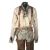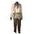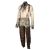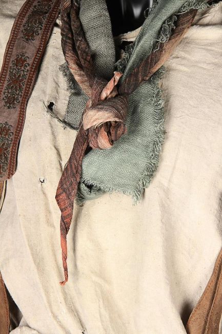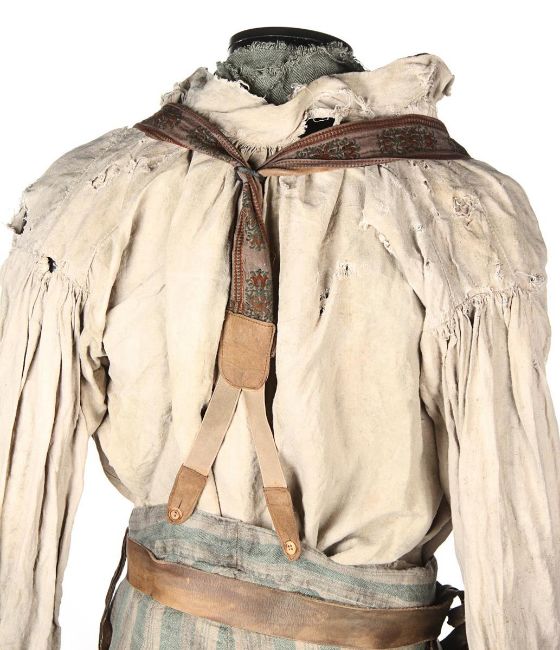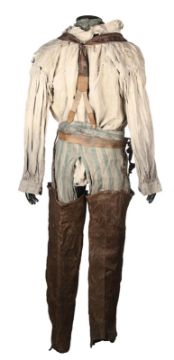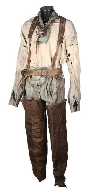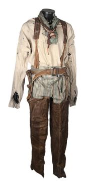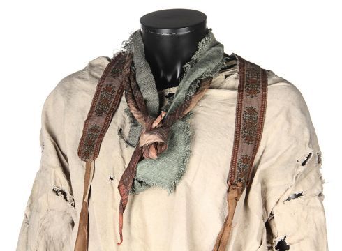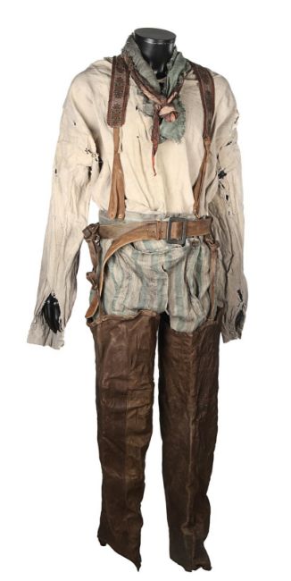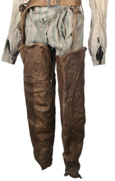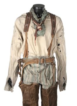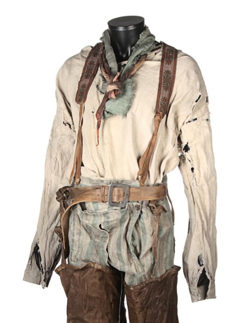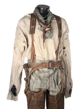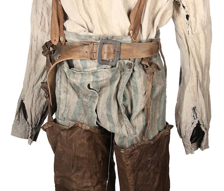 A costume worn by Thénardier (Sacha Baron Cohen) in Tom Hooper’s Academy Award®-winning musical drama Les Misérables. Thénardier wore his costume whilst he scavenged in the Paris sewers and discovered Jean Valjean (Hugh Jackman) and Marius Pontmercy (Eddie Redmayne). The costume consists of a cream shirt, green and brown striped trousers, a pair of brown leather waders, two necktie rags and a brown leather belt. Both the shirt and neckties are heavily distressed with dirt and numerous holes. The trousers are fastened with buttons at the waist and a set of brown leather braces featuring an embroidered flower motif. The trousers are split along the crotch, however overall the costume remains in very good condition. VAT Status - Margin