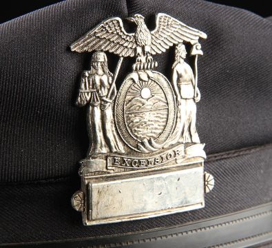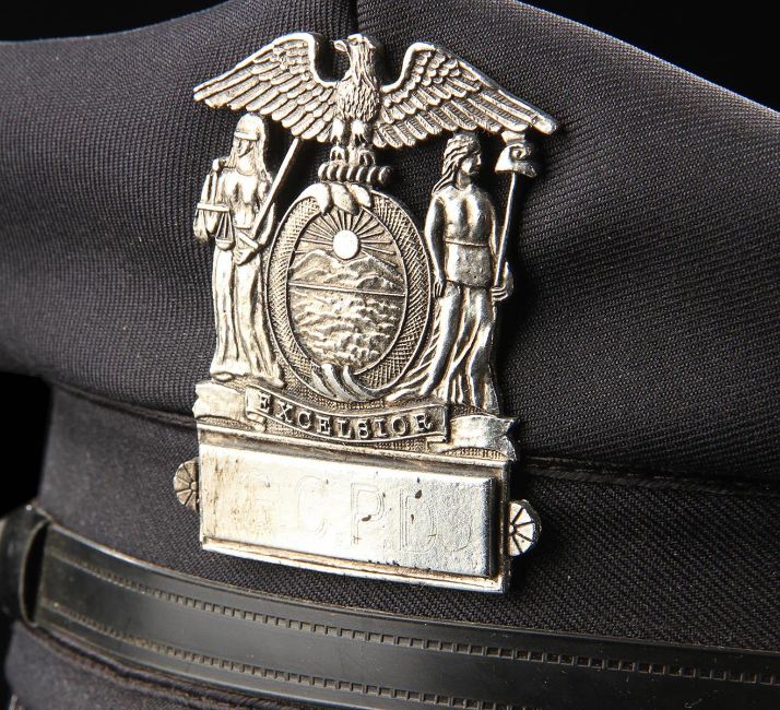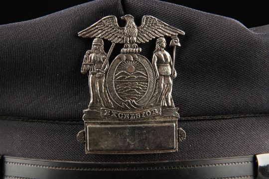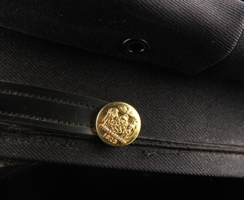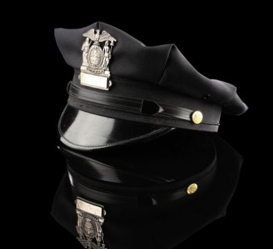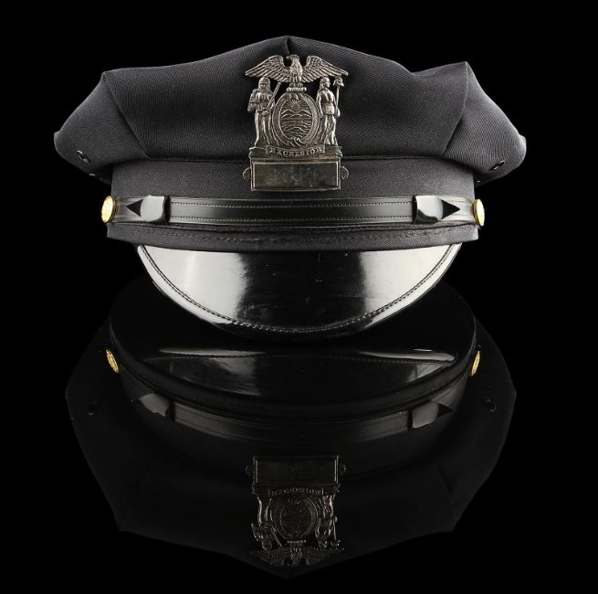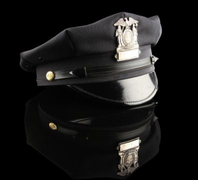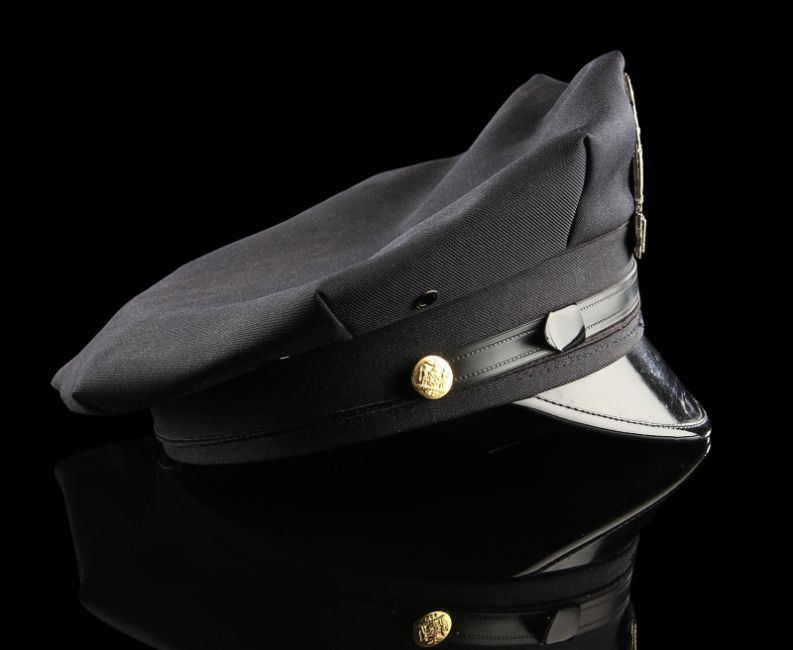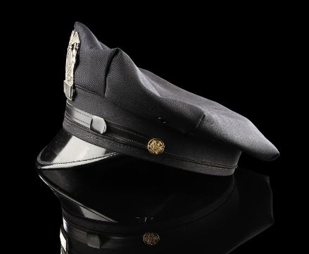 A Gotham City Police Department cap from the action film The Dark Knight Rises, directed by Christopher Nolan. Police officers of the GCPD wore their caps as they battled the forces of Bane (Tom Hardy) and the resurgent League of Shadows. The cap (size large) is made of black fabric with faux-gold buttons and a gloss black peak. The piece features a GCPD badge, which is finished in metallic faux-silver on the crown, secured with a pinback fitting. It displays some small marks to the crown and peak from use. This lot is supplied with a Warner Bros. certificate of authenticity in place of a Prop Store certificate. Payment plan on this item is restricted to a duration of one month. Please contact us for further information. VAT Status - DAGGER