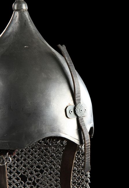 An arena helmet from Ridley Scott’s Oscar®-winning action epic Gladiator. The gladiators wore their distinctive helmets during the famous Battle of Carthage re-enactment, when Maximus (Russell Crowe) rallied the desperate men against the charioteers, ultimately overcoming all odds for a glorious victory. Made from fibreglass, the helmet is cast and impregnated with aluminium filings to create a realistic metal finish, with a resin spike on top, a metal chainmail neck protector and a leather tab across the nose. The inside is lined with black fabric and foam for comfort, and has two leather straps that fasten under the chin. Some wear is present from age and production use, including minor scratches to the fibreglass and leather wear. The helmet liner foam padding shows evidence of some breaking down. Dimensions: 26 cm x 20 cm x 51 cm (10" x 8" x 20") VAT Status - Margin TRIANGLE