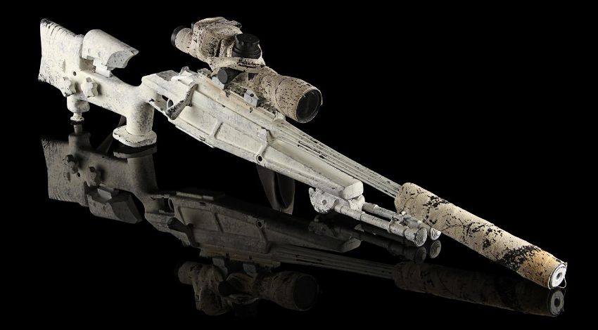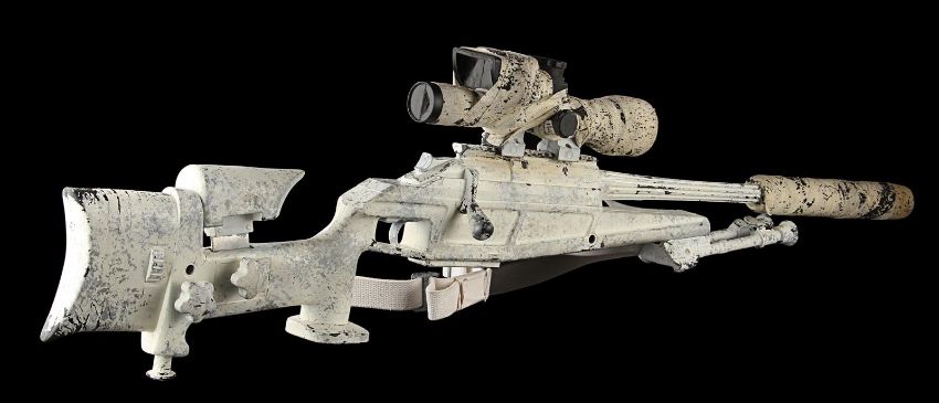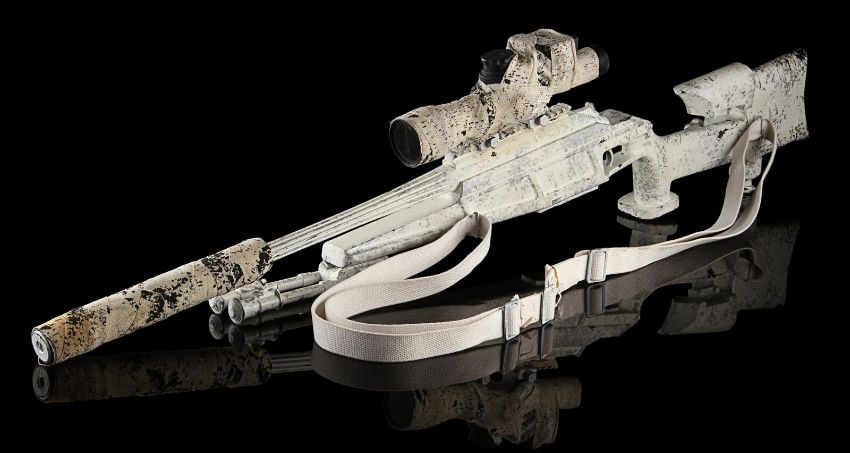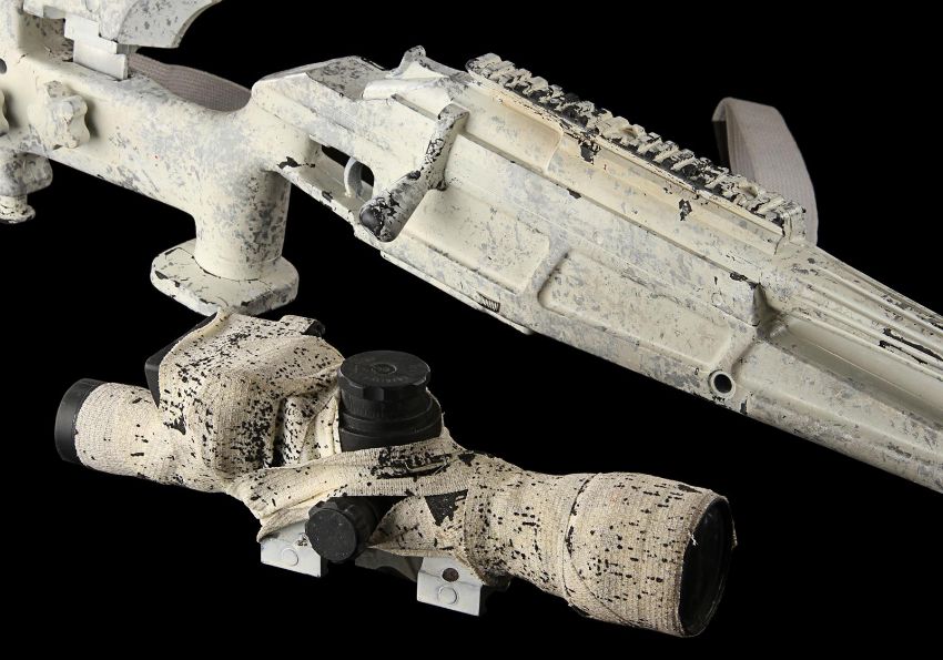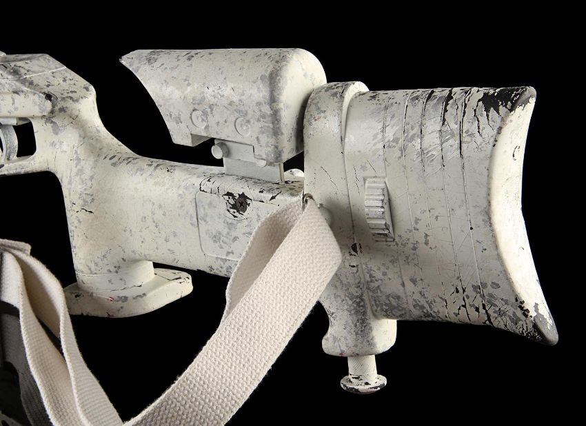 Cobb's (Leonardo DiCaprio) stunt sniper rifle from Christopher Nolan’s sci-fi thriller Inception. Cobb used his sniper rifle during the 'Winter Fortress Dream Level' within the mind of Robert Fischer (Cillian Murphy), as the band of psychological thieves sought to enter Fischer’s subconscious. The piece screen matches to shots of Cobb carrying the rifle on his back. Moulded from a hero Blaser R93 Tactical sniper rifle, this stunt weapon would have been used for scenes in which a hero, working version of the weapon was not required. It is equipped with a static Harris bipod, silencer and non-functional Barrett Optics scope. The piece is cast in hard rubber for the safety of the performers, and is finished in a winterised white and grey camouflage paint, with stretch tape applied on the silencer and scope. The high-quality casting means the weapon’s manufacturer markings are visible on the stock, receiver and scope dials. A white canvas sling is fitted on the rifle’s left-hand side. The weapon displays some wear to the paint finish from use in stunt sequences. Dimensions: 117 cm x 13 cm x 32 cm (46" x 5 ¼" x 12 ¾")Ownership of this item is restricted for UK residents to those who are registered re-enactors, galleries, or individuals in film, television or theatre production. Please inquire for further details. It is solely the buyer’s responsibility to check, prior to bidding, the legal status of this prop within their own country and its importation therein. VAT Status - Margin