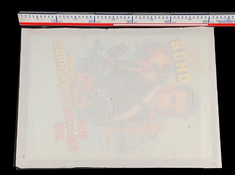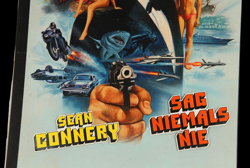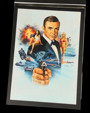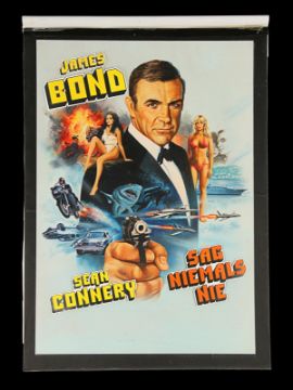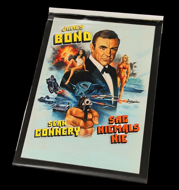 Tom Chantrell’s fully painted artwork – acrylics on paper adhered to artist board, with acetate overlay – for the 1983 James Bond film, Never Say Never Again. Believed to have been commissioned for the video release of the film, it features Bond (Sean Connery) in the classic 007 pose with pistol drawn amidst Bond girls and various action scenes. This artwork was never used, but remains Chantrell’s only artwork for a Bond film. Accompanied by a letter of provenance from the Chantrell Archive. Dimensions: 37 cm x 51 cm (14 ½" x 20") Please note this lot is sold without copyright, reproduction rights, licensing agreements or any other type of legal release. VAT Status - Margin