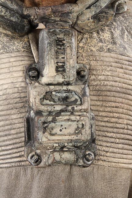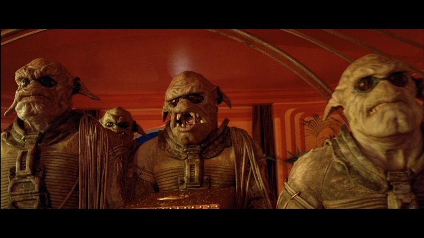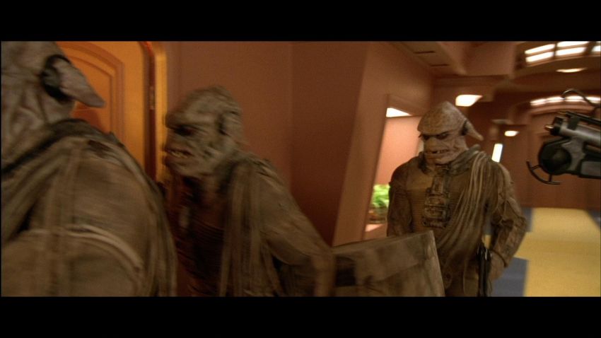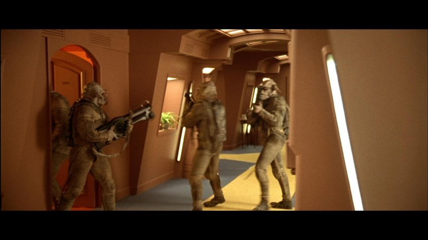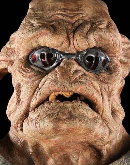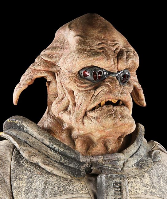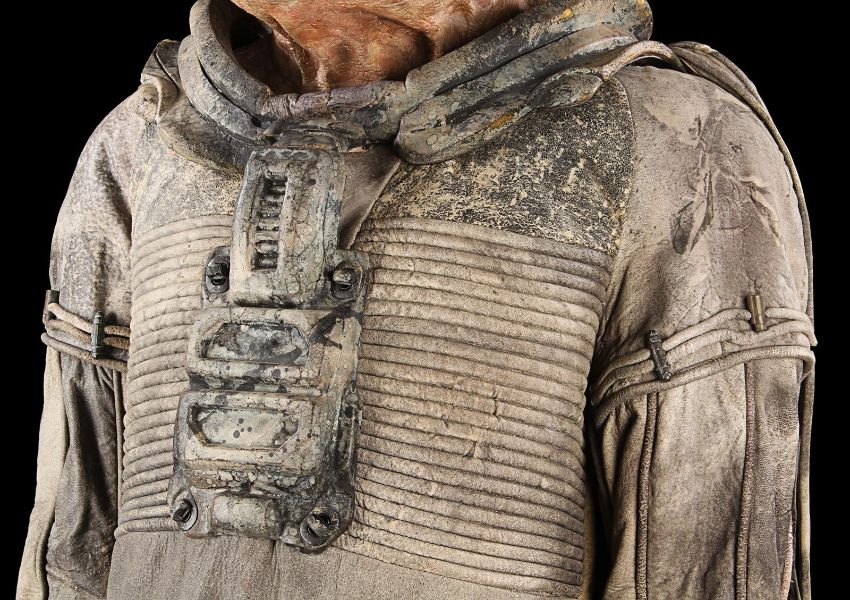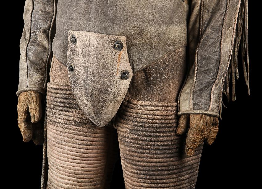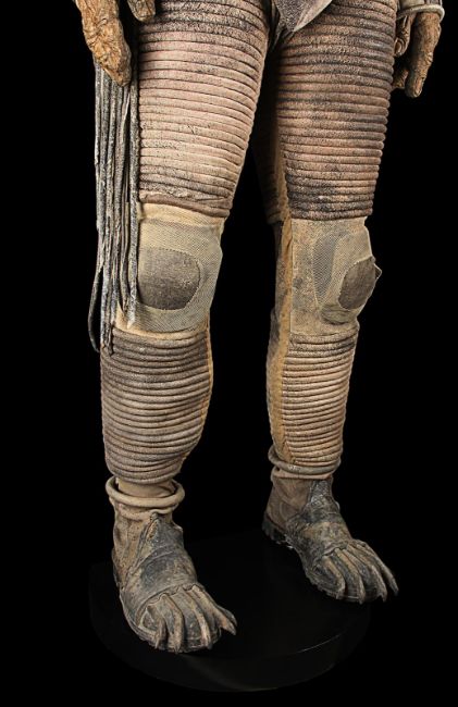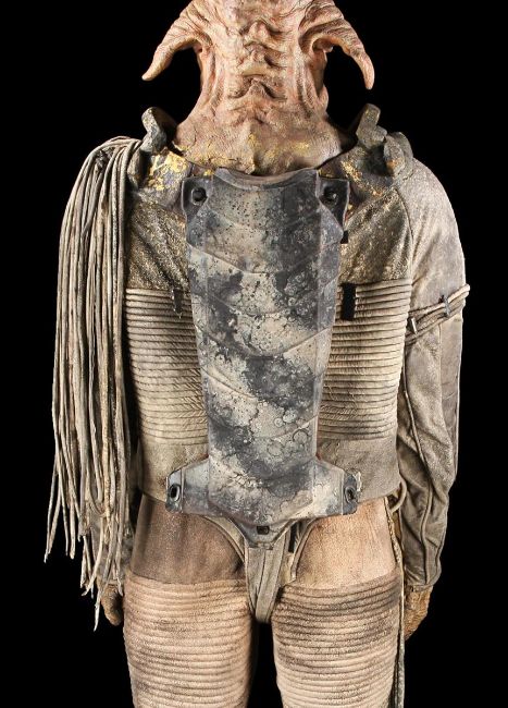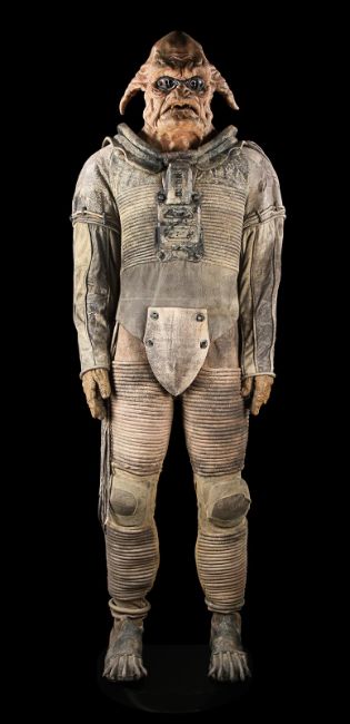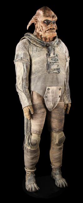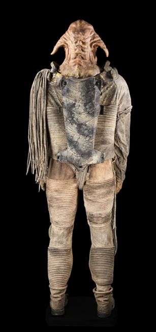 A Mangalore costume from the Luc Besson sci-fi adventure The Fifth Element. Mangalores acted as mercenaries for hire, helping in the search for the element stones before ultimately being double-crossed by their human employer, Jean-Baptiste Emanuel Zorg (Gary Oldman). The jacket and trousers are made from thick grey suede with deep, armour-like ridges across the chest, thighs and shins. There are suede cords attached to the shoulder and hip, with a chest-mounted control panel made from foam rubber. The Mangalore head is made from foam rubber and is realistically painted in mottled brown and purple 'flesh' tones with teeth and a pair of goggles fitted to add to the alien look of the creature. The hands and feet are also made from foam rubber, painted and finished to the same high standard as the head. The costume is presented on a custom-made mannequin display. Signs of wear are evident, including minor hardening of the foam with minor cracks and splits. Dimensions (displayed): 35 cm x 65 cm x 195 cm (13 ¾" x 25 ½" x 77") VAT Status - Margin TRIANGLE
