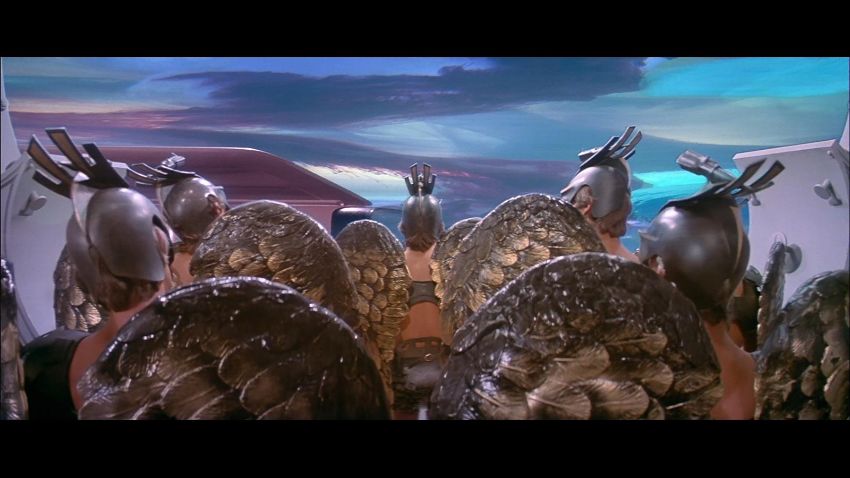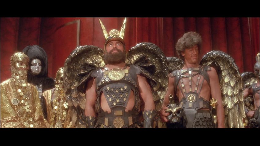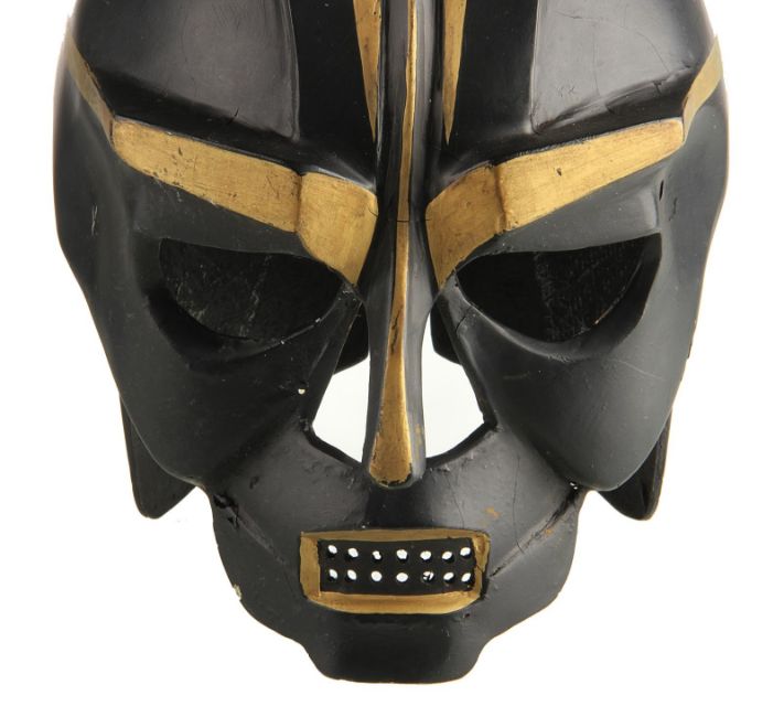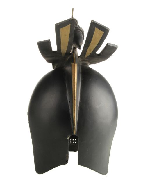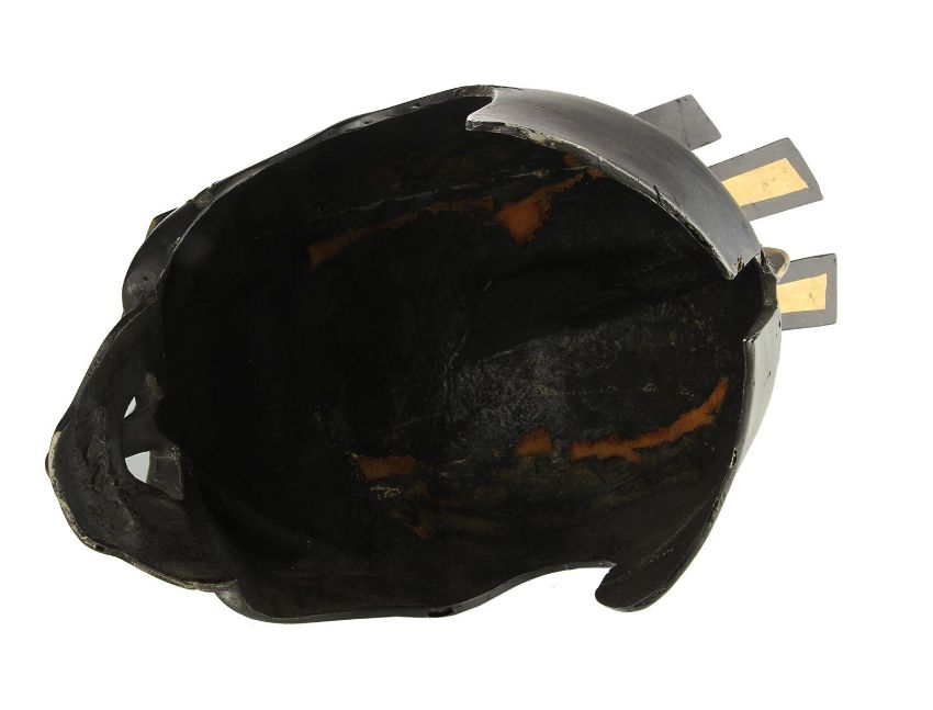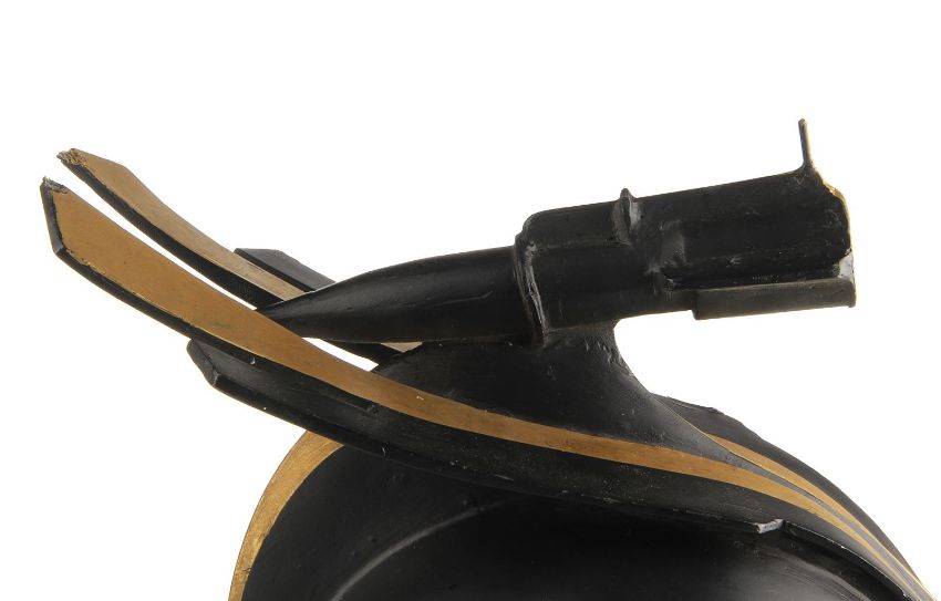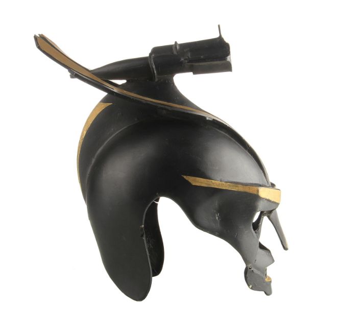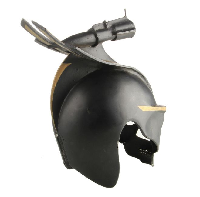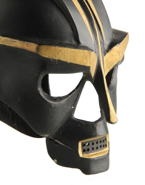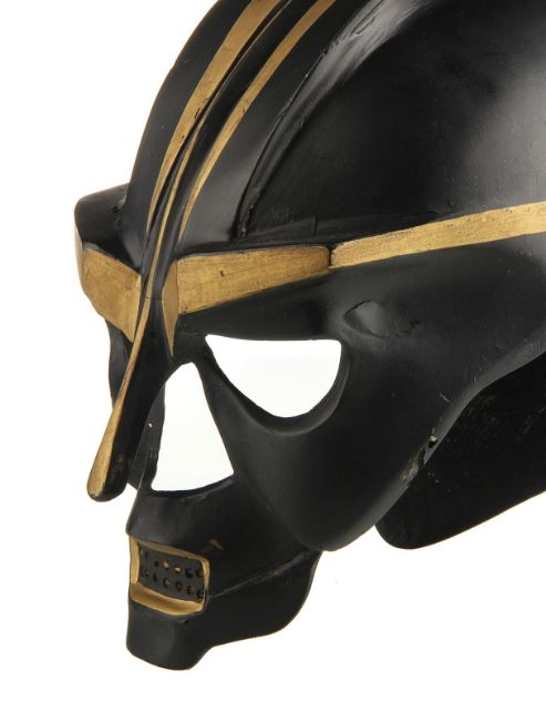 A helmet worn by one of the Hawkmen in Mike Hodges' sci-fi adventure Flash Gordon. The winged race from Sky City are seen throughout the movie, commanded by Prince Vultan (Brian Blessed). Made of fibreglass, the helmet is painted black with faux-gold accents and still retains the original scope fixed to the top, which is often missing on other examples. The fibreglass is chipped and cracked in places, but overall the piece remains in good condition. Dimensions: 30 cm x 18 cm x 34 cm (12" x 7" x 13 ½") VAT Status - Margin TRIANGLE