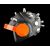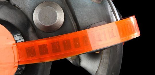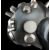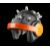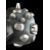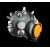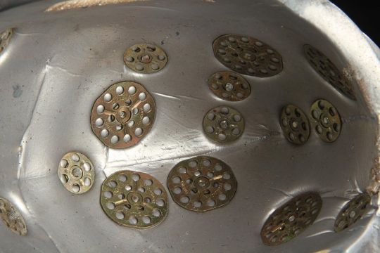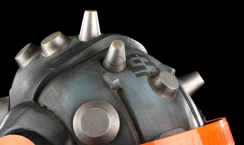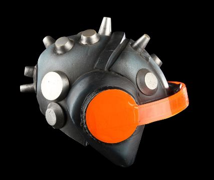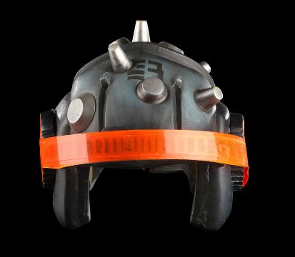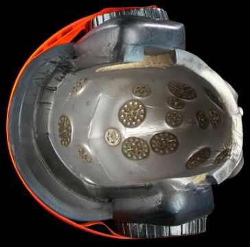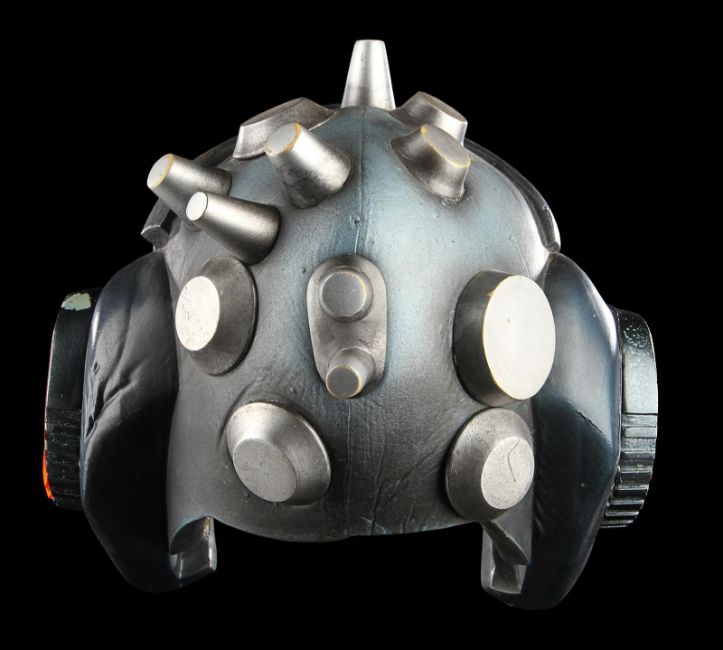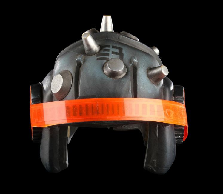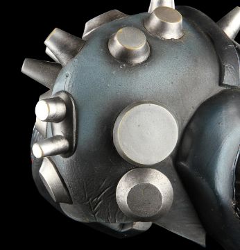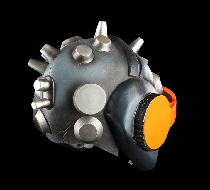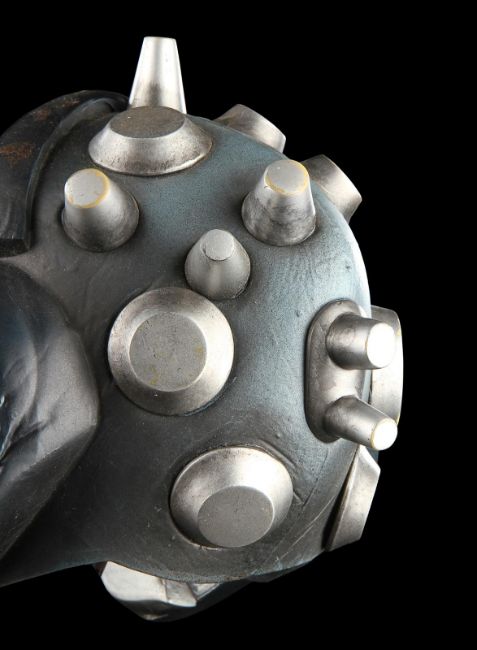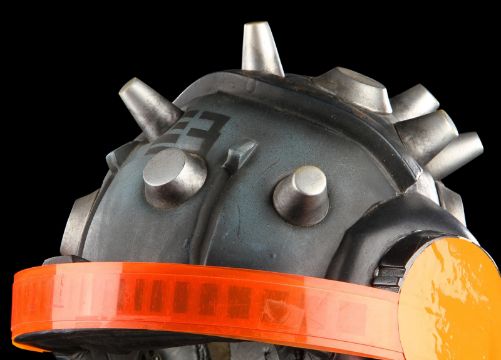 A Fhloston Paradise medic’s helmet worn in the Luc Besson sci-fi adventure The Fifth Element. Designed by Jean Paul Gaultier, the helmet is made of foam rubber, with an array of resin discs and spikes across the exterior. Orange plastic and fabric is attached across the front brim to create a faux-visor, with the piece finished in metallic blue and faux-silver paint. Markings on the head gear are sprayed black, with additional distressing applied to give the piece a rugged, worn appearance. The piece has deformed slightly over time, with some chips and wear to the paint finish and the resin detailing. Dimensions: 30 cm x 25 cm x 25 cm (12" x 10" x 10") VAT Status - Margin TRIANGLE