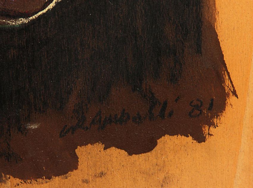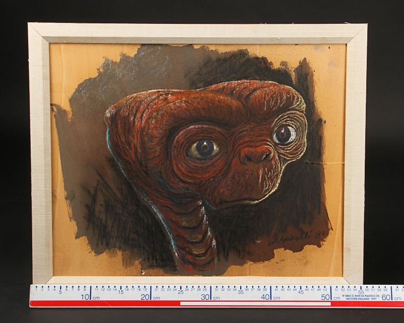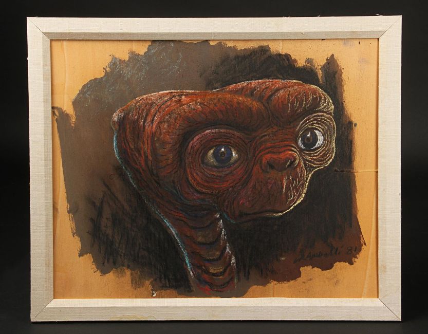 A concept painting of E.T. from Steven Spielberg’s sci-fi adventure film E.T. the Extra-Terrestrial. The artwork was done as a concept during the production of E.T. by creator Carlo Rambaldi – who won an Oscar® for his work on the film – and later gifted to another member of the production crew. The portrait is accomplished in acrylics on wooden board with oil crayon highlights in blue, yellow and white. Rambaldi, who was known as the ‘father of E.T.’, signed the lower right-hand corner of the illustration and dated it ‘81’. The painting is presented in a canvas-wrapped frame with paper backing. The piece shows some light signs of wear around the frame, however overall it remains in very good condition. Dimensions: 2 cm x 56 cm x 46 cm ( ¾" x 22" x 18 ¼") Please note this lot is sold without copyright, reproduction rights, licensing agreements or any other type of legal release. VAT Status - Margin
