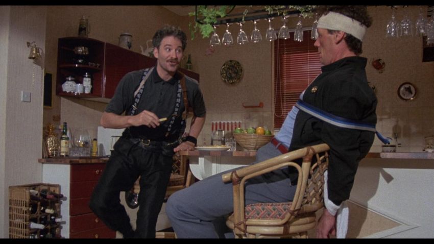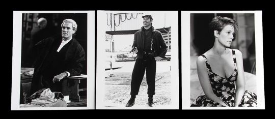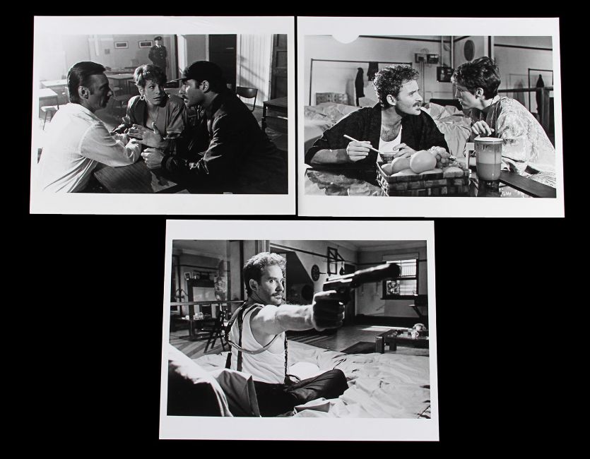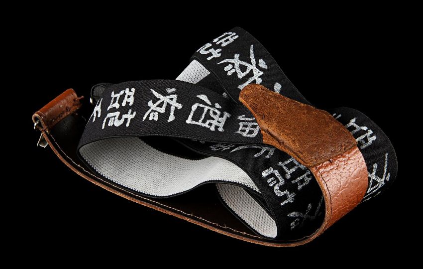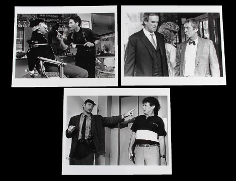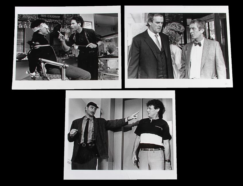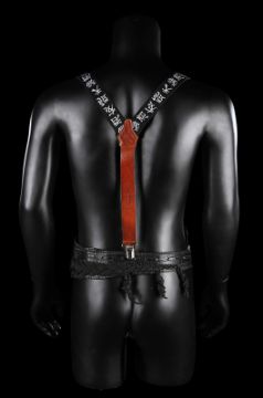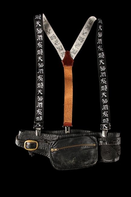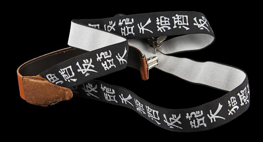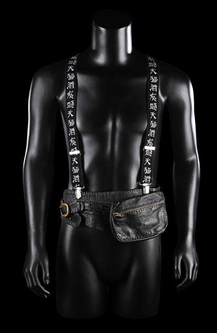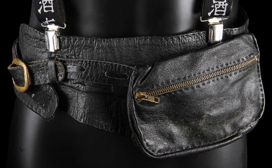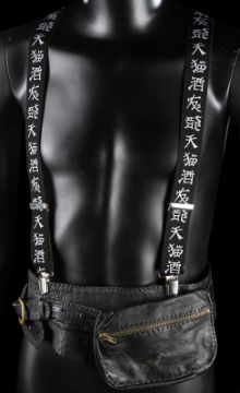 Otto’s (Kevin Kline) belt and two pairs of braces from the Academy Award®-winning caper comedy A Fish Called Wanda. Otto wore his braces and a belt throughout the film, as he and Wanda Gershwitz (Jamie Lee Curtis) attempted to locate the diamonds after the heist. Custom-made for the film, the belt is constructed from black leather, with a zip up pouch and black braiding on the back, a metal buckle and Velcro strap fastening. The braces – one hero pair and one used as a stand-in pair – were the only pairs used for filming and are made of black elastic with a Chinese symbol design and a brown leather back strap. The hero set displays hand-painted Chinese symbols and a 'Ray and Guy Company' brand stamp on the back. Fifteen black and white 8 x 10 promotional photographs accompany the lot, featuring numerous scenes from the film including images of Otto that can be matched to the braces. The belt displays light wear and scratches from use. Please note the photographs in this lot are sold without copyright, reproduction rights, licensing agreements or any other type of legal releases. VAT Status - Margin