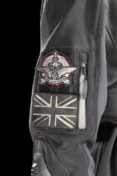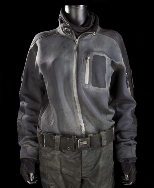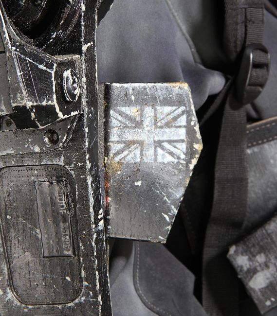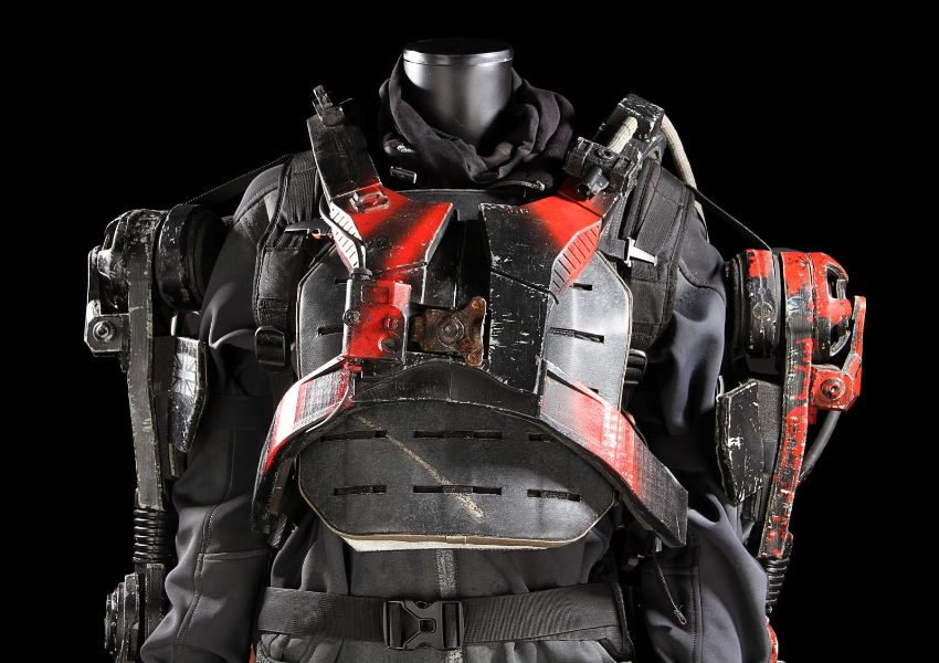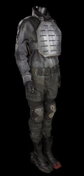 Rita Vrataski’s EXO suit from the sci-fi action film Edge of Tomorrow, directed by Doug Liman. Rita Vrataski (Emily Blunt), the ‘Angel of Verdun’, wore her combat armour for the repeated time-looping Normandy beach landings where she died repeatedly in front of deserter-turned-hero Major William Cage(Tom Cruise). This particular EXO suit was worn by stunt performers in the film’s frenetic battle scenes. The EXO suit was designed to be lightweight, while still possessing the hulking movements of military hardware. The costume is made primarily of foam rubber, with sections of armour adorned throughout. The suit is secured to the wearer via an array of Velcro and clip-fastening straps. Hinged joints are fitted at the shoulders, elbows, hips and knees to assist in mobility during use. Short cannon barrels are integrated into the left arm. Additional hoses have been dressed to give the appearance of a hydraulics system throughout the suit. The entire suit is finished in a distinctive black and red paint finish, with a grey Union flag painted on the right arm. Orange tracking markers are present on the backpack to facilitate the visual-effects addition of Vrataski’s shoulder cannons. Worn under the EXO armour is a full UDF uniform consisting of a dark grey jacket (marked ‘Liang Yang’)with integrated elbow pads and Union flag and unit patches on the arms; a set of plate armour made of foam with Velcro fastenings and web strapping; a pair of custom camouflage combat trousers (marked ‘Liang Yang’) with webbing belt; a pair of Dr. Martin combat boots with heel and toe cap dressing (UK size5); a pair of fingerless gloves; a black neck comforter and a pair of knee pads (marked ‘Rita’ and ‘Liang’). Both the armour and uniform are heavily distressed for use, with mud spatters, stains, scratches and grime applied to provide a combat-worn appearance. Some additional wear and small tears are present to the foam components from use and age. This lot is supplied with a Warner Bros. certificate of authenticity in place of a Prop Store certificate. Payment plan on this item is restricted to a duration of one month. Please contact us for further information. VAT Status - DAGGER