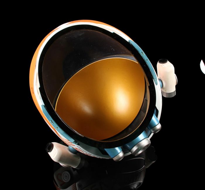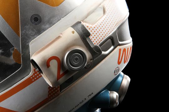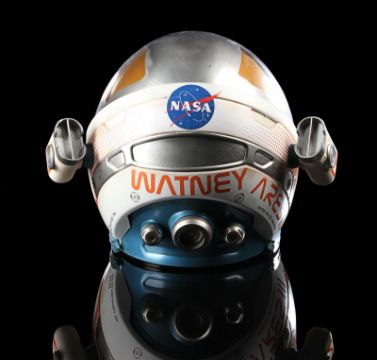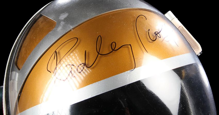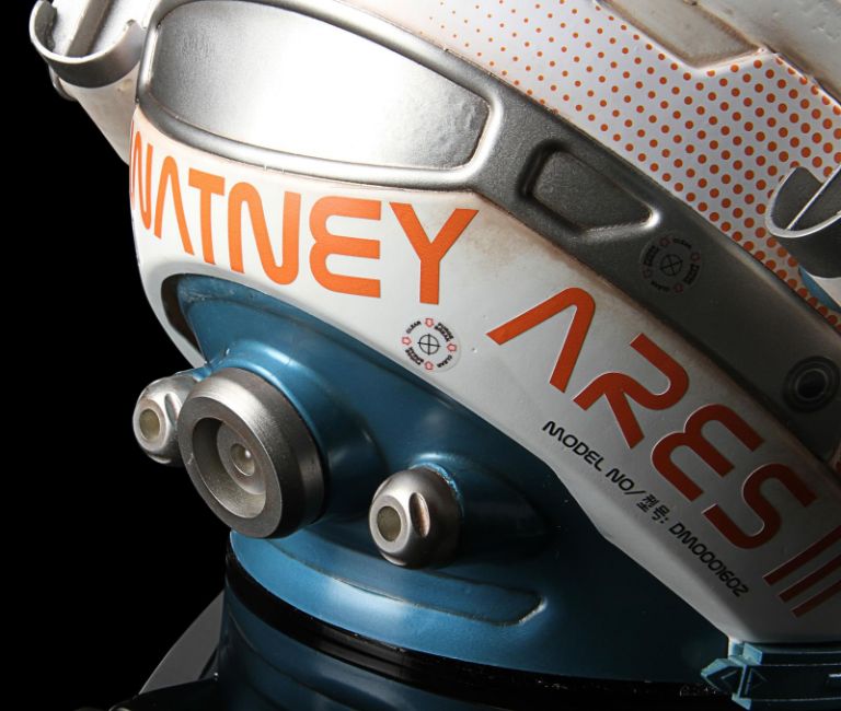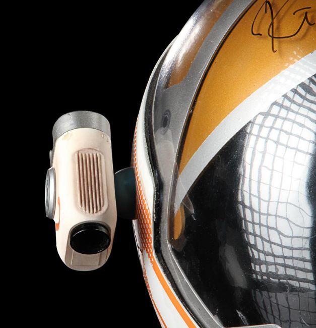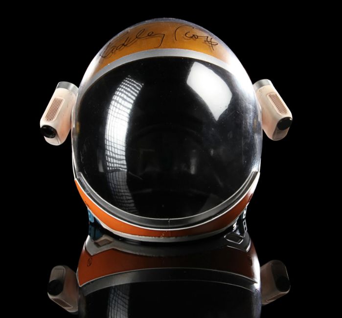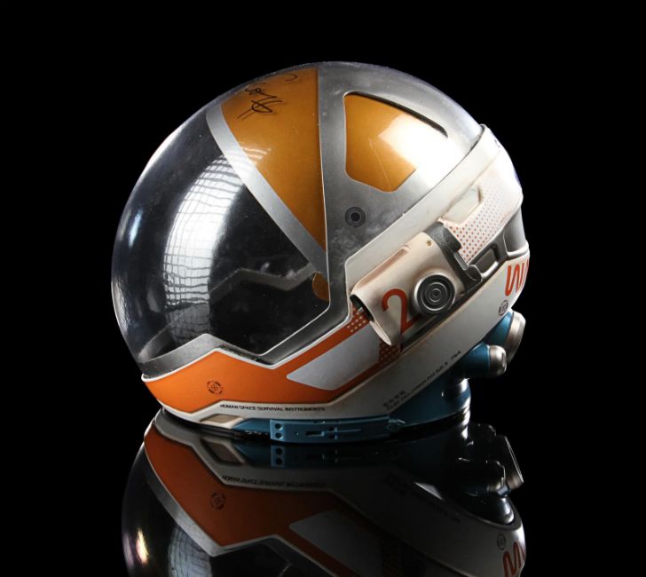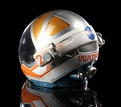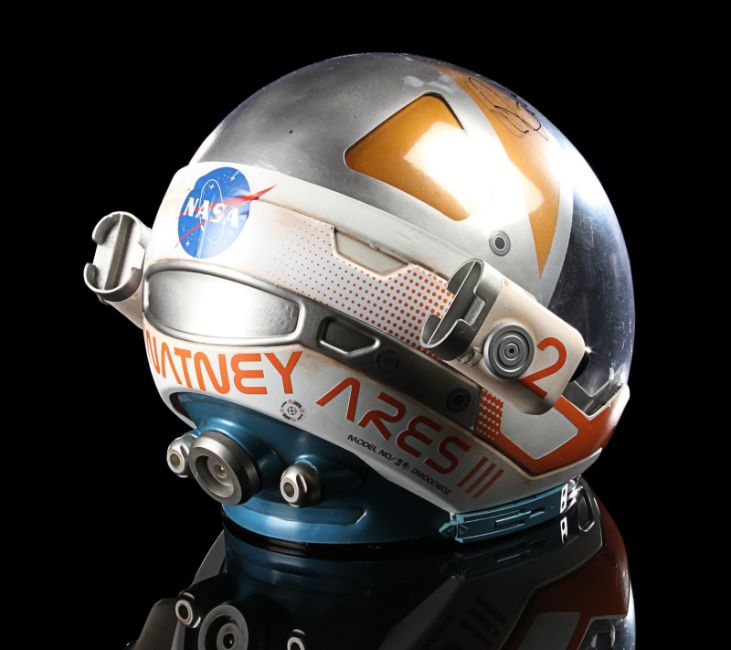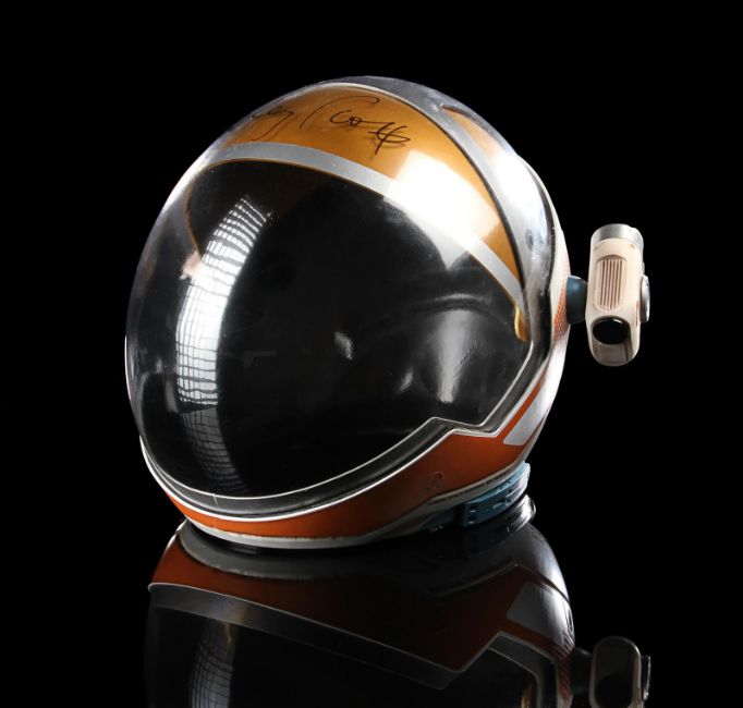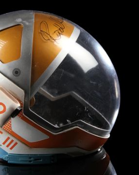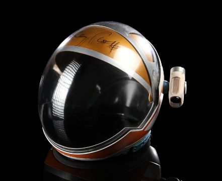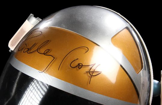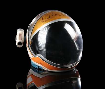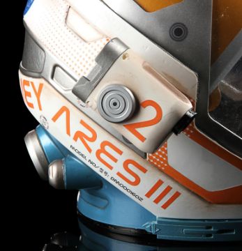A replica Ares III helmet from Ridley Scott’s Oscar®-nominated sci-fi fantasy The Martian. The helmet was given away as a promotional gift for publicity purposes and features Ridley Scott’s autograph in black marker across the visor. Designed by Scott's long-time collaborator, costume designer Janty Yates, the helmet is made from white ABS plastic with orange vinyl appliques, two model lights and a faux-silver and faux-gold painted sun visor. It displays numerous stickers, including the NASA logo, "Watney" and mission details across the back. Intentionally dressed down, the helmet has a small chip on the light and minor lifting on the vinyl appliques. Dimensions: 35 cm x 40cm x 32 cm (13 ¾" x 15 ¾" x 12 ½") VAT Status - Margin TRIANGLE
