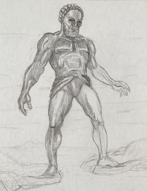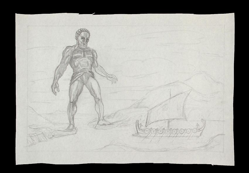 A hand-drawn concept sketch c. 1961 showing Talos from the Don Chaffey fantasy-adventure Jason and the Argonauts. The artwork shows the giant bronze statue blocking the path of the Argo as it attempts to leave the Isle of Bronze. It is rendered in pencil on white paper. This image was transposed almost identically into the final film, with the only real change being the addition of a helmet and sword for Talos. The edges are irregularly cut, however overall the piece remains in very good condition. Dimensions: 51 cm x 35 cm (20" x 13 ¾")The final key art version of this image features on pages 106-107 of The Art of Ray Harryhausen by Ray Harryhausen and Tony Dalton, and on page 157 of Ray Harryhausen: An Animated Life by Ray Harryhausen and Tony Dalton. Both published by Aurum.Please note this lot is sold without copyright, reproduction rights, licensing agreements or any other type of legal releases. VAT Status - Margin TRIANGLE