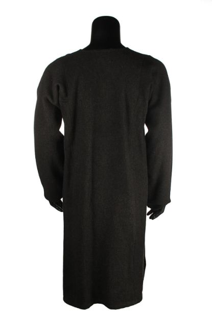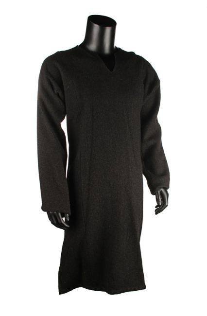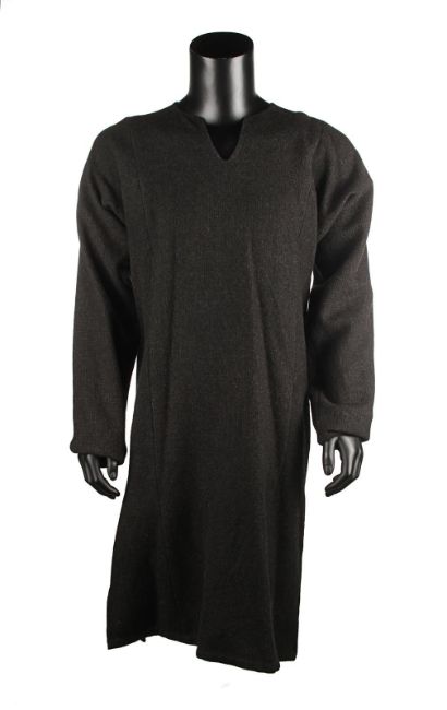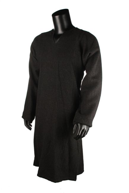 Macbeth's (Michael Fassbender) woollen tunic from Justin Kurzel’s adaption of Shakespeare’s tragedy Macbeth. Macbeth wore his black tunic in numerous scenes throughout the film, most notably after Macduff (Sean Harris) discovers the body of the murdered King Duncan (David Thewlis). The knee-length tunic is made from black wool, with a shallow V-neck and vents along both side seams. The tunic displays a ‘The Costume Workshop Ltd' label with 'Michael Fassbender Macbeth' handwritten in faded ink and remains in very good condition. VAT Status - DAGGER