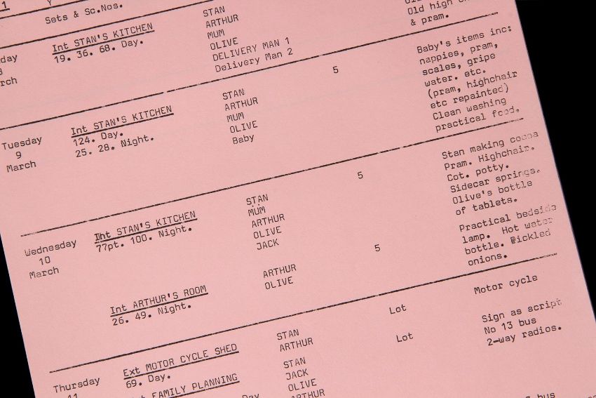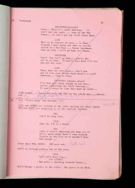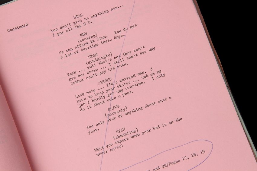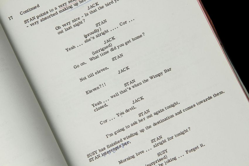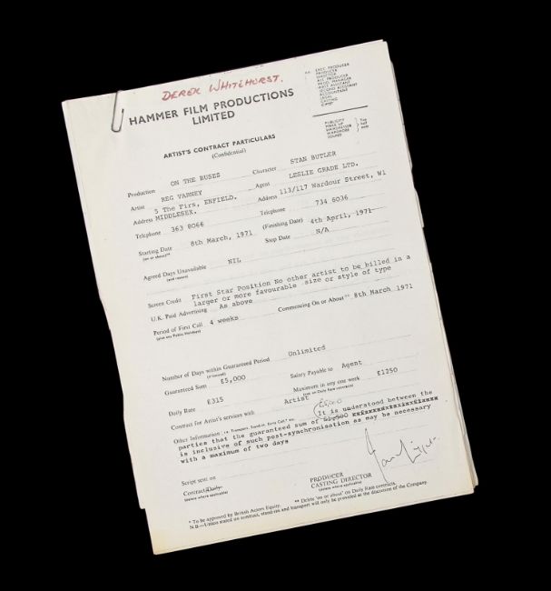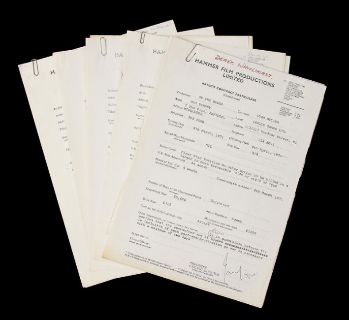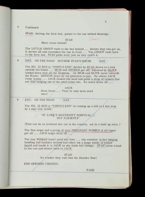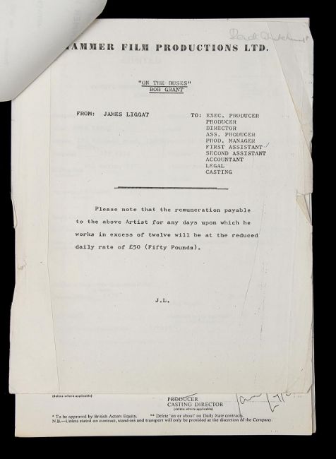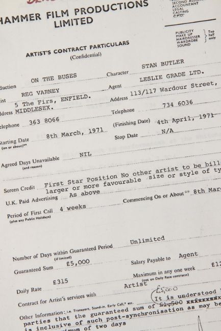 A script and production paperwork from Harry Booth’s comedy On the Buses. The script was used by Derek Whitehurst, the first assistant director, and features handwritten annotations throughout. It contains 130 printed US Legal pages, including blue, yellow and pink-coloured revisions, bound with metal fastenings. The red card cover shows a cut-out window revealing the film’s title on the first page. The script is accompanied by a set of printed cast contracts detailing the actors’ contact details and payment information, and a shooting schedule printed on pink paper displaying shot requirements. The pieces show signs of production use, including minor tears on the script cover and worn edges. Dimensions(script): 28 cm x 22 cm x 2 cm (11" x 8 ¾" x ¾") VAT Status - Margin