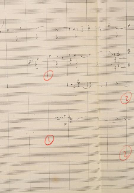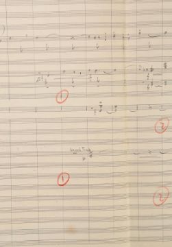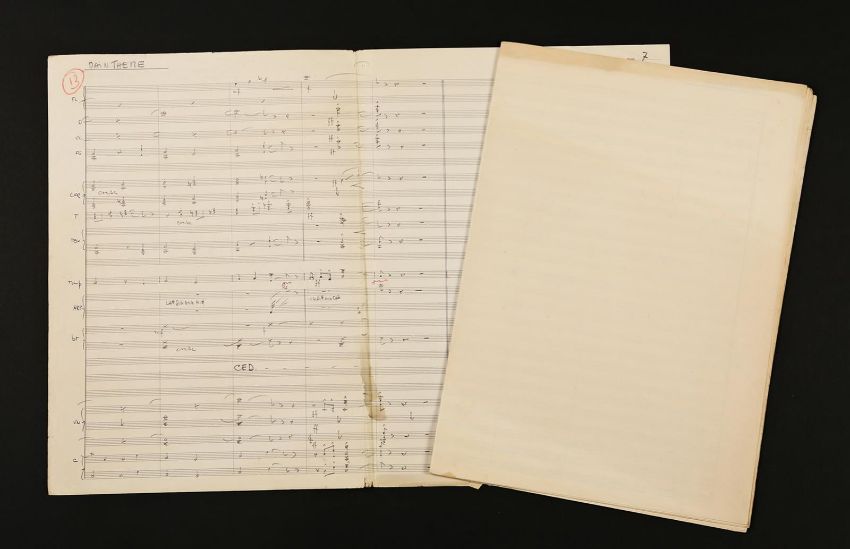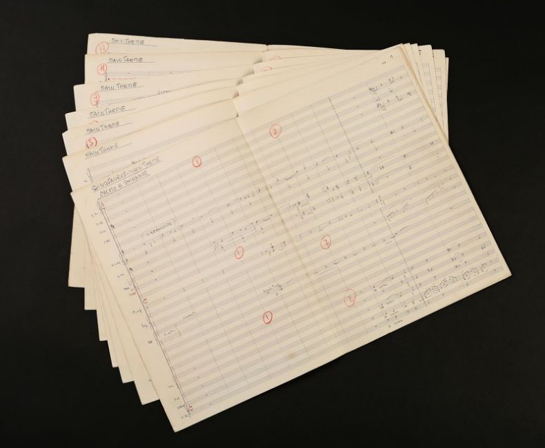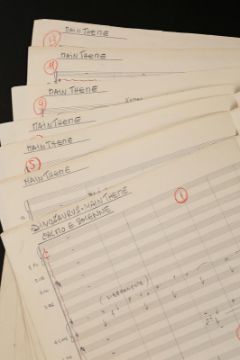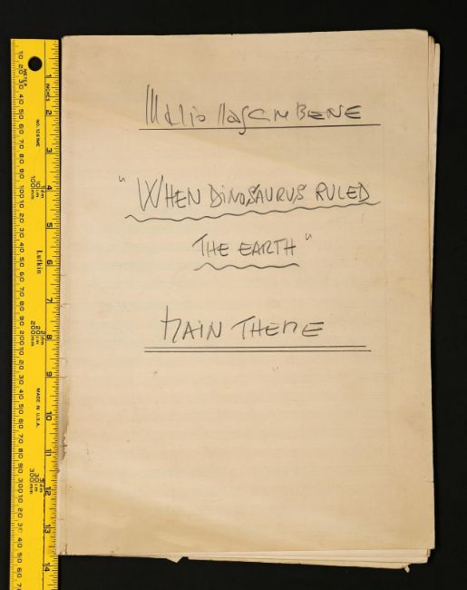 The main theme handwritten by Mario Nascimbene for Val Guest's Hammer horror When Dinosaurs Ruled the Earth. The seven page score shows handwritten musical notation in pencil over printed staffs. 'Main Theme' is written on the top left of each page. The score is folded down the centre of each page, with the back of the seventh page serving as the cover. The lot shows some wear to the paper due to production use and age, with small tears to the edges of the paper, leaving the lot in fair, used condition. Dimensions:24 cm x 36 cm x 1 cm (9 ½" x 14" x ¼") VAT Status - OMEGA