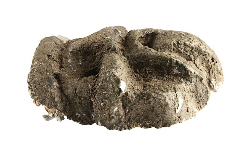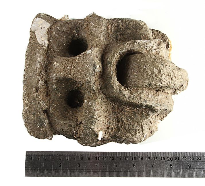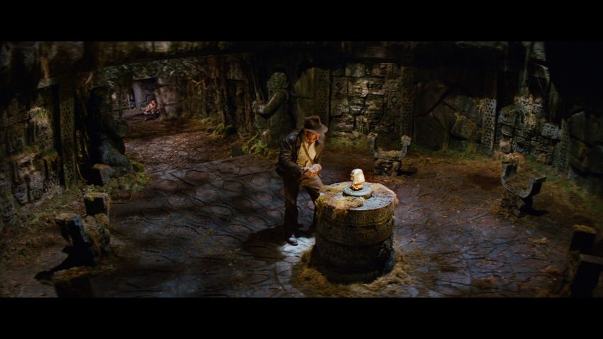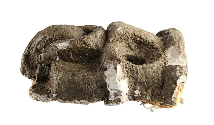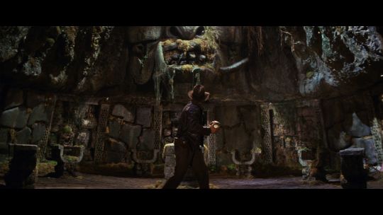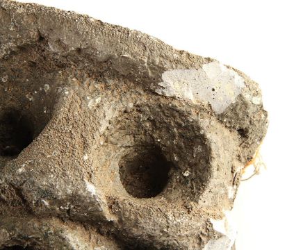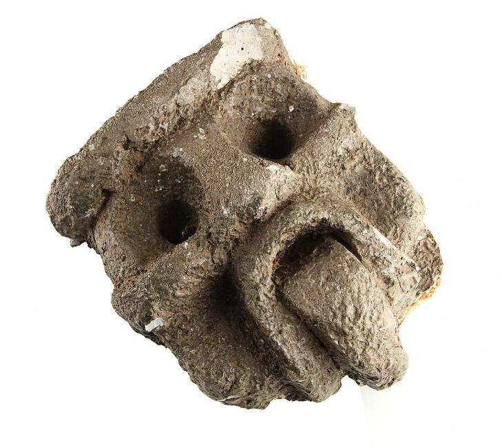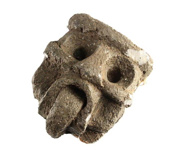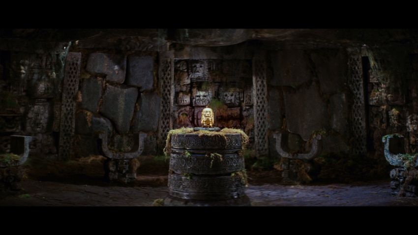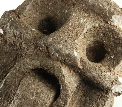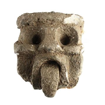 A throne carving from Steven Spielberg’s action-adventure classic Raiders of the Lost Ark. The ancient temple Indiana Jones (Harrison Ford) enters to retrieve the golden idol featured six stone thrones, each decorated with a tribal face carving. The piece was salvaged from the set by a crew member. The face is constructed from plaster reinforced with twine. The front has been painted dark grey to replicate the appearance of carved stone. The carving displays a number of chips and cracks, but remains in good condition. Dimensions: 8 cm x 18 cm x 22 cm (3 ¼" x 7" x 8 ¾") VAT Status - Margin
