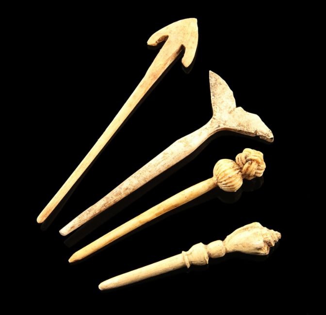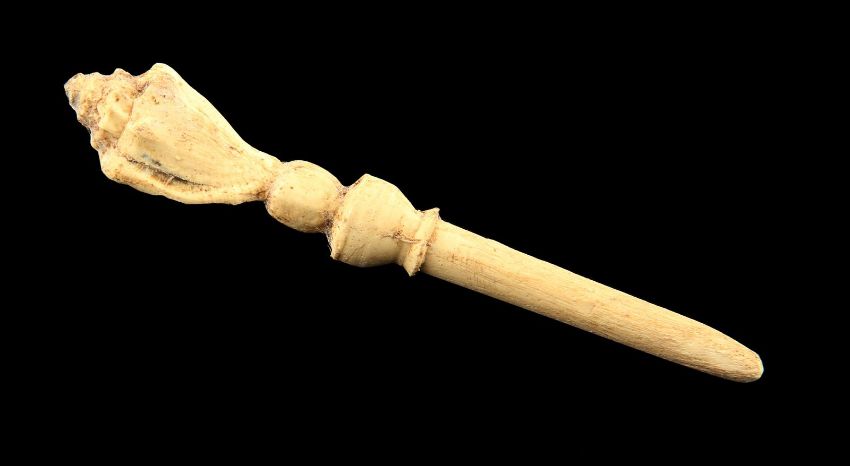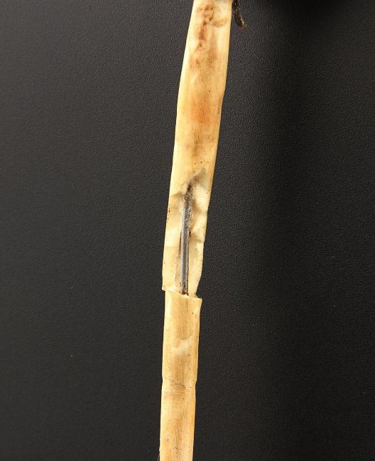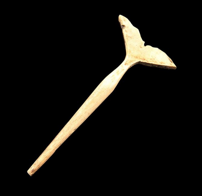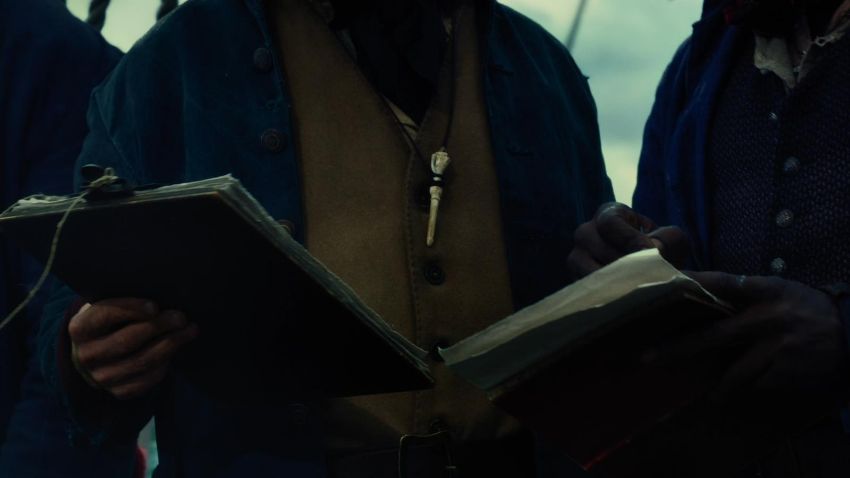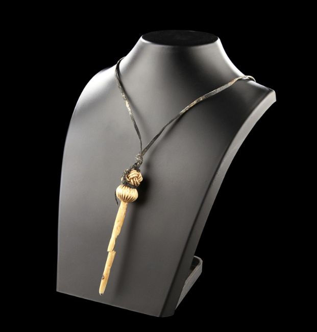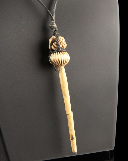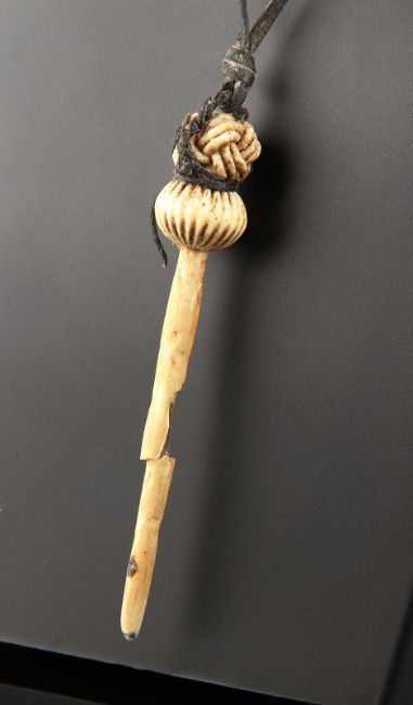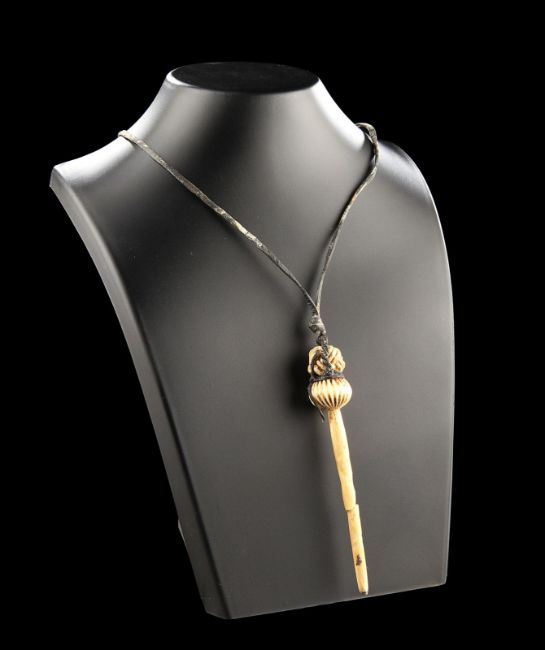 Owen Chase’s (Chris Hemsworth) whale pin necklace from the action-adventure film In the Heart of the Sea, directed by Ron Howard. Chase and his fellow seamen wore their whale pins throughout the film as they sailed the seas hunting whales. The pins were awarded to sailors as a symbol of successfully killing the largest whales. The necklace pin is cast in resin with a metal armature, and resembles scrimshaw ivory featuring a ball of twine detail secured to a length of brown leather thong. Accompanying it are four other whale pins with nautical-themed carved headpieces, including a whale’s tale, a conical shell, a harpoon point and another ball of twine. The necklace shows a break in the pin’s length and leather wear. Dimensions (longest pin): 15 cm x 3 cm x 1.5 cm (6" x 1 ¼" x ½")This lot is supplied with a Warner Bros. certificate of authenticity in place of a Prop Store certificate. Payment plan on this item is restricted to a duration of one month. Please contact us for further information. VAT Status - DAGGER