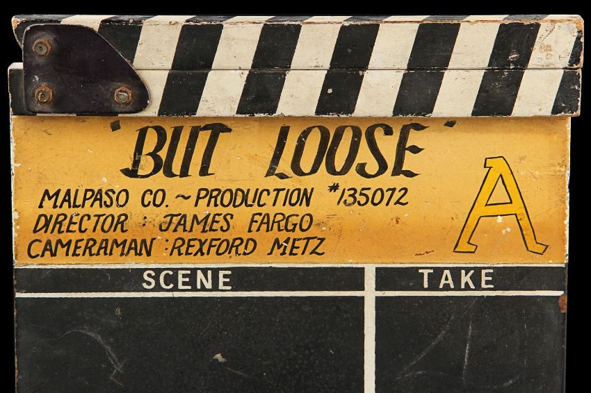 A clapperboard from the James Fargo adventure comedy Every Which Way But Loose. Marked for use with the production's main 'A' camera, the clapperboard is made of wood and features the shortened title 'But Loose' painted across the top. The Clint Eastwood-founded Malpaso Company production number and the names of director James Fargo and director of photography Rexford Metz can be found below. There are sections at the bottom of the board for noting the scene and take, with traces of chalk numbers still present. Markings are visible on the reverse for use in camera lens focus tests. The board has damage to the bottom left corner, with signs of natural production wear throughout. Dimensions: 4 cm x 28 cm x 23 cm (1 ½" x 11" x 9") VAT Status - Margin