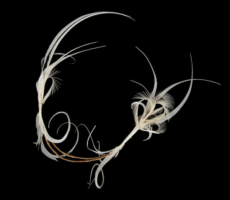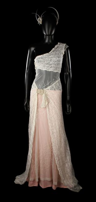 Juliet's (Keira Knightley) wedding dress from Richard Curtis’ romantic comedy Love Actually. Juliet wore her dress during her wedding to Peter (Chiwetel Ejiofor). The custom-made dress is comprised of a number of different layers starting with a pale pink slip skirt and an asymmetric dress made of net material featuring white sequin detailing and snap fastenings along the side. A lace wrap-around skirt and matching short-sleeved asymmetric bolero are worn over the dress, with the skirt featuring a large metal brooch with pearl and diamanté detailing to fasten. A sheer, white, long-sleeved chiffon jacket, with a long sweeping train features feather and bead detailing around the collar and cuffs, and a small beaded hook at the end of the train and hook and eye fastenings running down the front. The costume is completed with a feathered hairband and faux bridal bouquet featuring a length of white chiffon leaves. There is slight fraying on the hem of the lace skirt and many of the leaves are no longer present on the bouquet, however overall the costume remains in very good condition. VAT Status - Margin