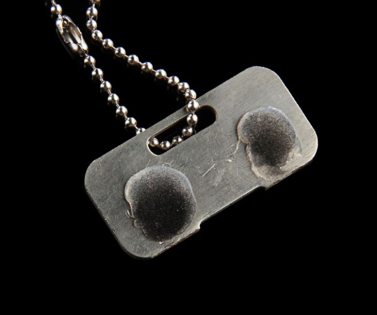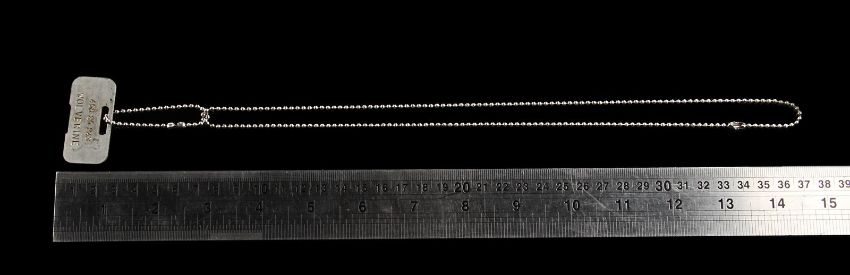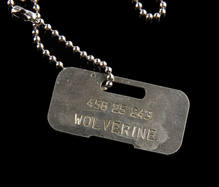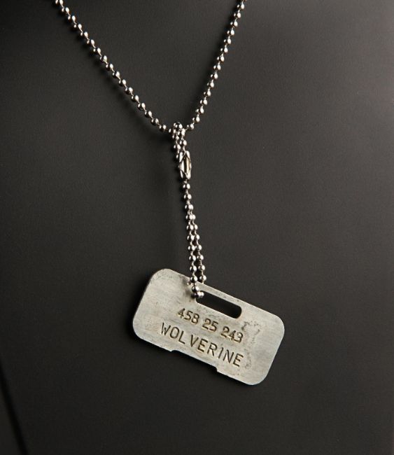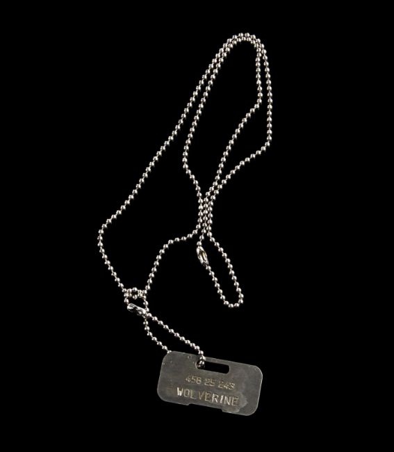 Wolverine’s (Hugh Jackman) dog tag from the Bryan Singer superhero film X-Men. Wolverine wore his distinctive ID throughout the film and later gave it to Rogue (Anna Paquin) for safe keeping.The tag is made from metal with engraved text reading "Wolverine" and "458 25 243." It hangs from a metal ball chain necklace comprised of two chains. There are small scratches and marks on the back, but it remains in good condition. It is accompanied by a Certificate of Authenticity from the 20thCentury Fox archives. Dimensions (tag): 4.5 cm x 2.25 cm x0.25 cm (1 ¾" x 1" x ¼") VAT Status - Margin TRIANGLE