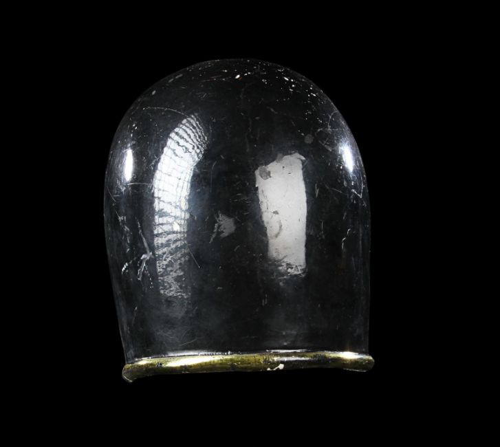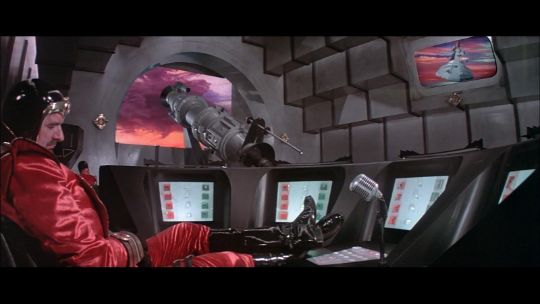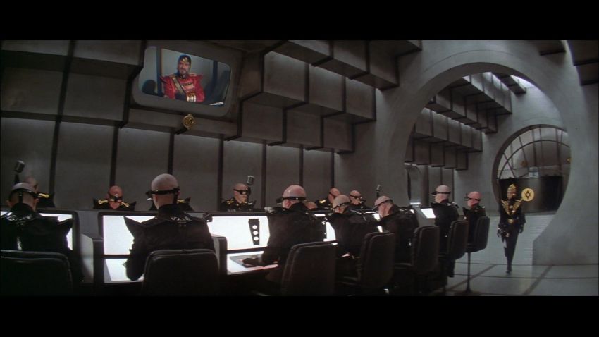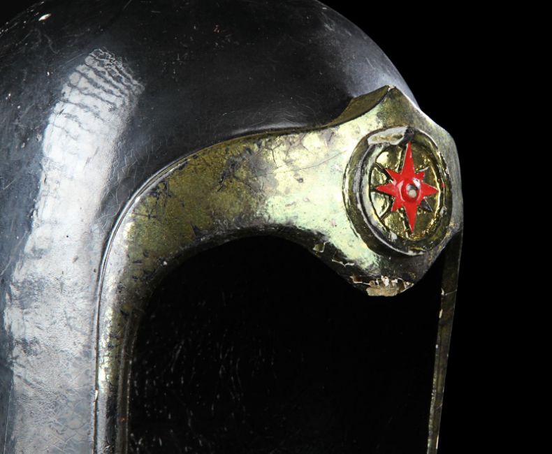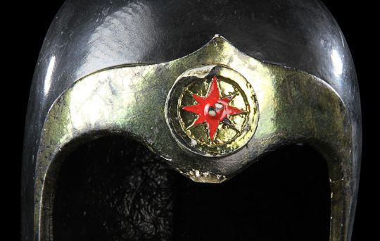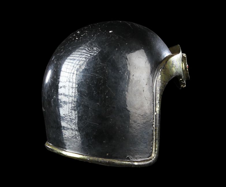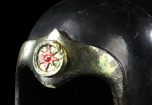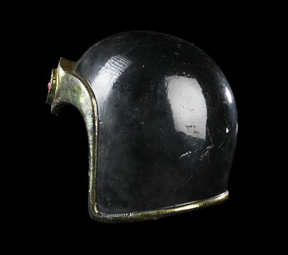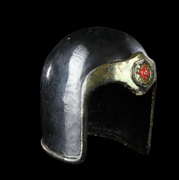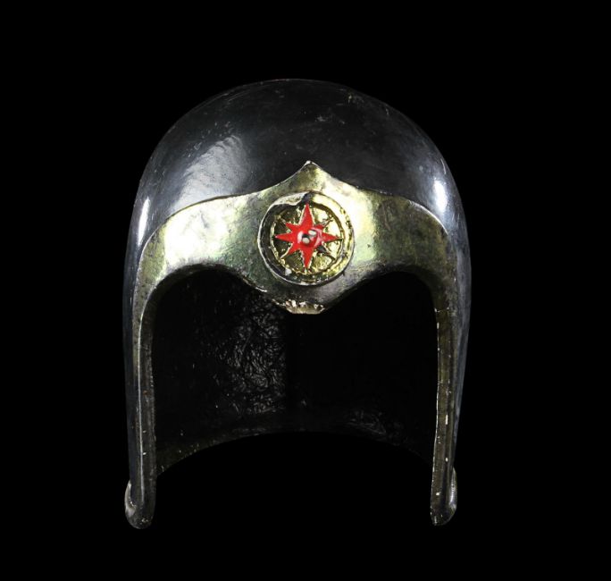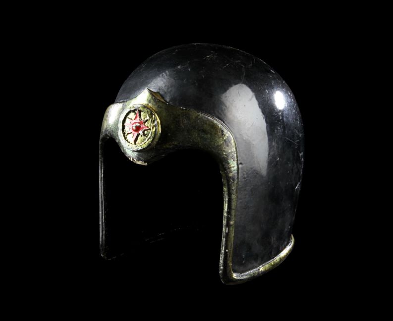 A helmet worn by one of Emperor Ming’s (Max von Sydow) guards in Mike Hodges' sci-fi adventure Flash Gordon. Various versions of this helmet were made, differentiated only by the emblem on the brow. This particular type of helmet was worn by the guards operating the weapons batteries of Mongo’s imperial palace. Made from fibreglass, it is painted a glossy black with gold-coloured embellishments and a red star emblem. There are some chips and cracks and the golden paint has faded with age, but overall the piece remains in good condition. Dimensions: 20 cm x 16 cm x 21 cm (8" x 6 ¼" x 8 ¼") VAT Status - Margin TRIANGLE