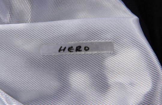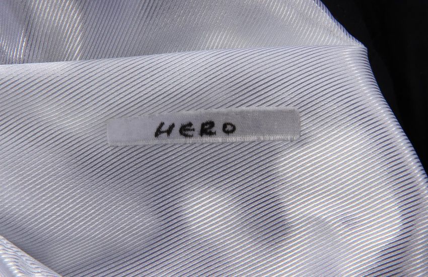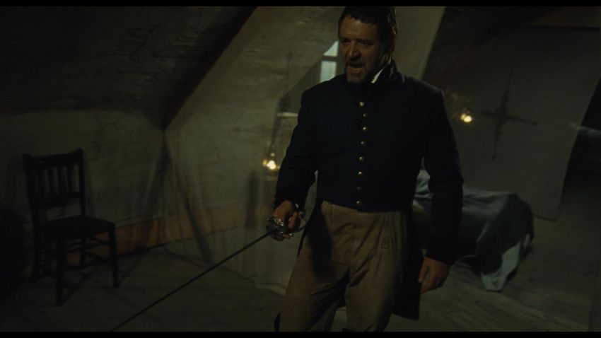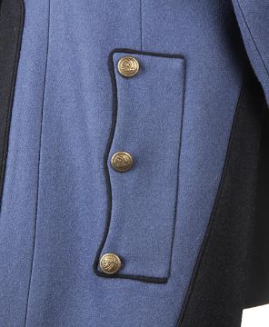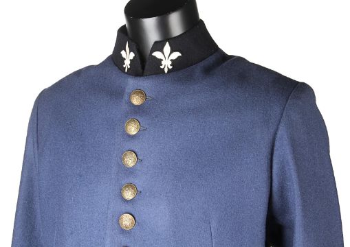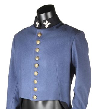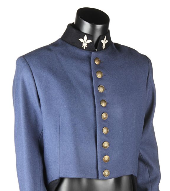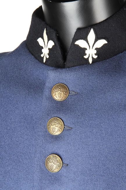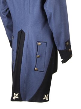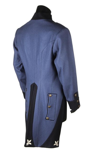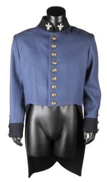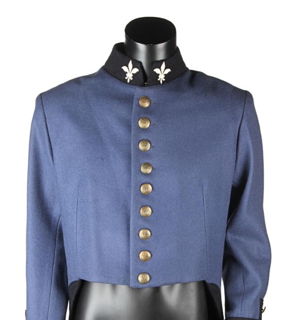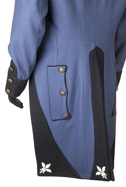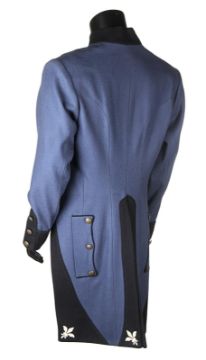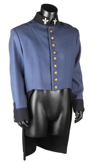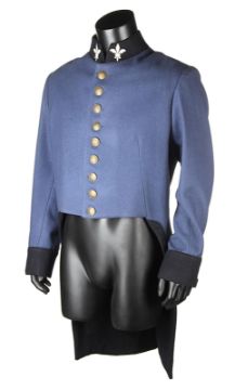 Javert's (Russell Crowe) hero sword fight tailcoat from Tom Hooper’s Academy Award®-winning musical drama Les Misérables. Javert wore his coat during a swordfight with Jean Valjean (Hugh Jackman) in an attempt to take him into custody after Valjean broke his parole. The tailcoat is made of navy blue wool with black woollen edging along the collar, cuffs and hem. Brass buttons are present throughout the coat and it features a white embroidered fleur-de-lis symbol on the collar and hem. A hook and eye fastening is located on the collar and a small Velcro-sealed pocket is present on the inside of the tail. An Academy Costumes label is located inside the collar and a handwritten label reading 'Hero' can be found in the right sleeve. VAT Status - Margin