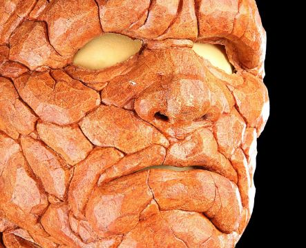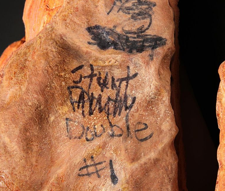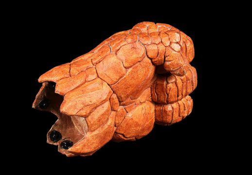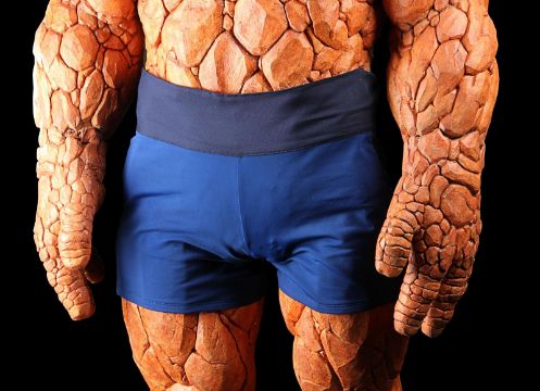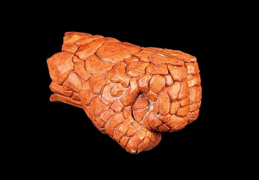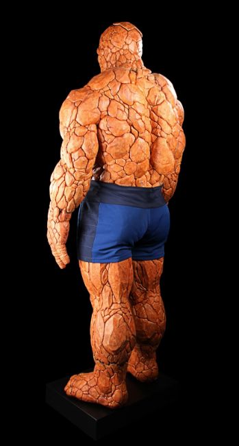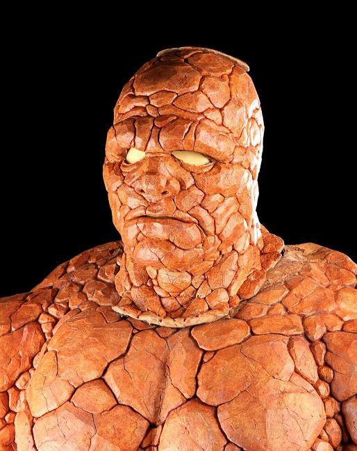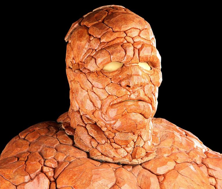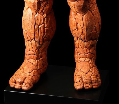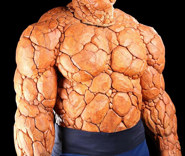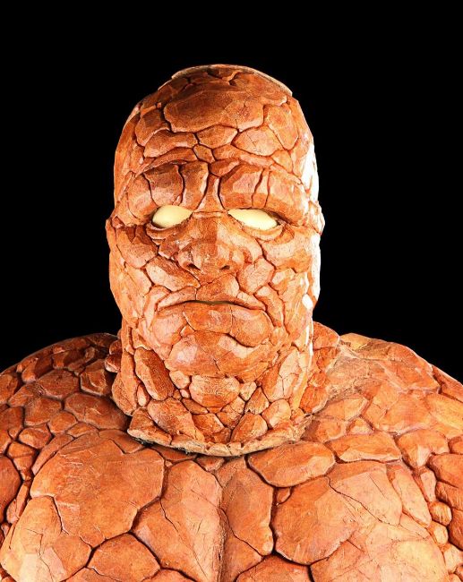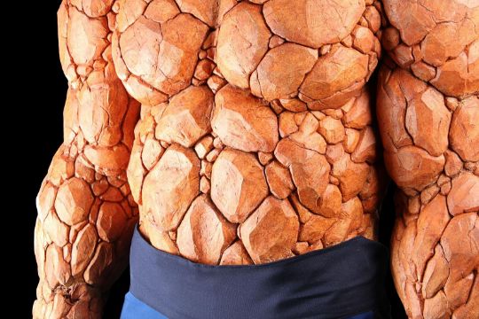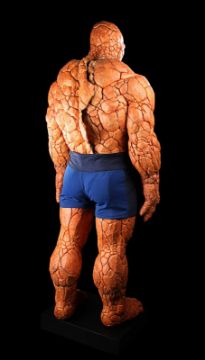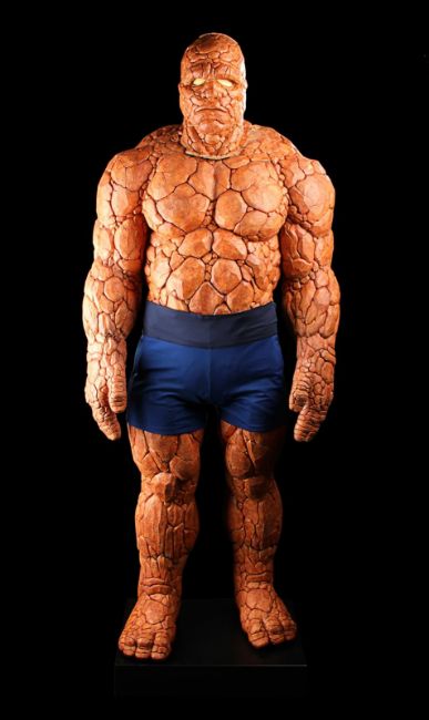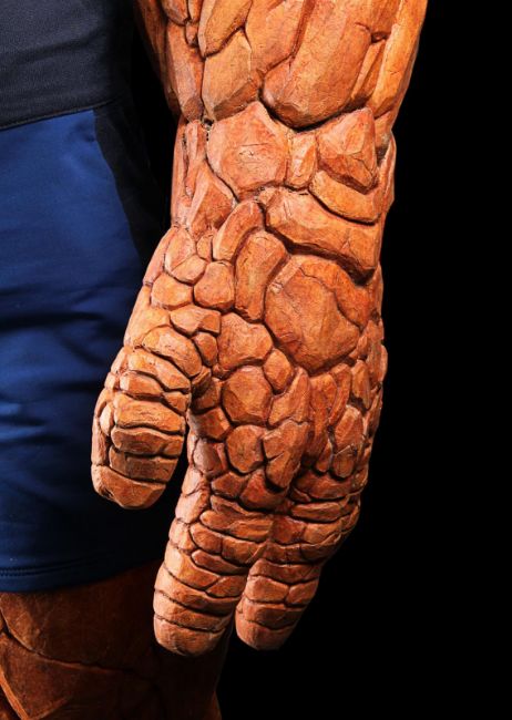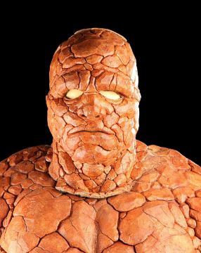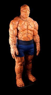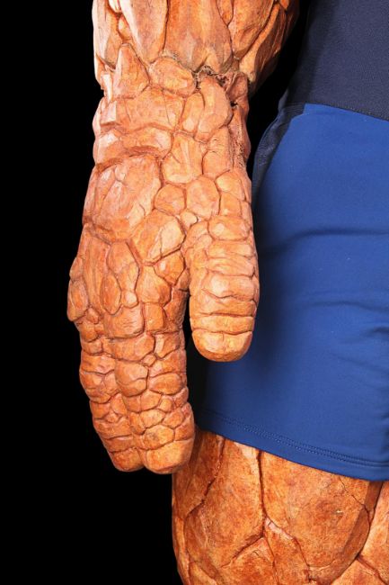 Thing’s costume from Tim Story’s superhero adventure-sequel Fantastic 4: Rise of the Silver Surfer. Ben Grimm (Michael Chiklis), transformed into the rock-like Thing, stood with the team throughout the film as they confronted the Silver Surfer (Doug Jones) and attempted to save the Earth from the powerful force of Galactus. Made from foam latex, the costume consists of separate appliances for the head, torso with arms attached, legs, hands and feet. The components feature ridged, rock-like patterns with an orange paint finish that has a wash applied to darken the recesses of Thing’s skin. Each piece is fitted with black press studs and Velcro to secure them together. The torso has a zip running up the length of the back to fasten, and is labelled 'Stunt Double #1'. The legs are fitted to a stretchable mesh that is suspended from the shoulders on elasticated braces. Both the legs and feet show the label 'Rob' and the hands display the label 'Stunt'. The headpiece has holes for the eyes, nose and mouth, with a skull cap that can be removed from the main body. The costume includes a pair of large blue Lycra shorts with a navy waist band. Accompanying the costume is another hand, also labelled 'Stunt'. This ensemble is presented on a custom-built display mannequin and base. Signs of wear are evident, including paint chips and hardening at the edges, with minor splits in the foam latex. Dimensions (on display): 48 cm x 73 cm x 184 cm (19" x 28 ¾" x 72 ½") VAT Status - Margin
