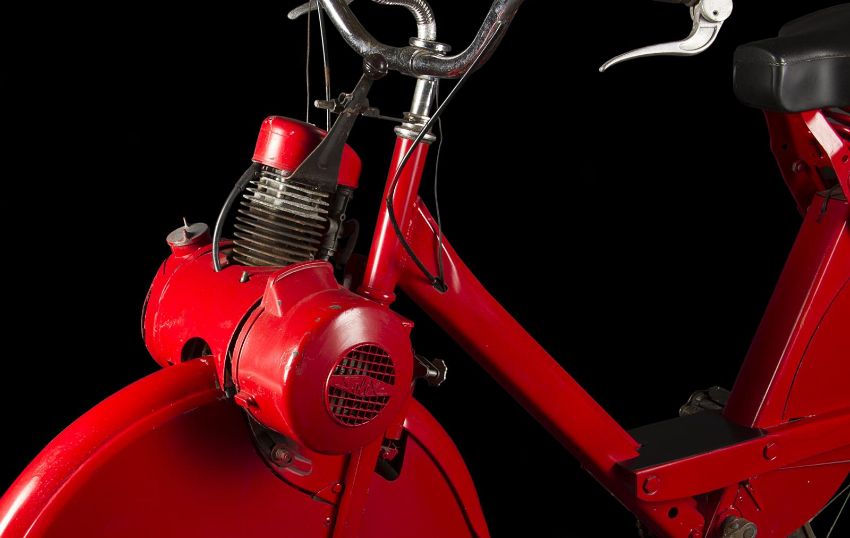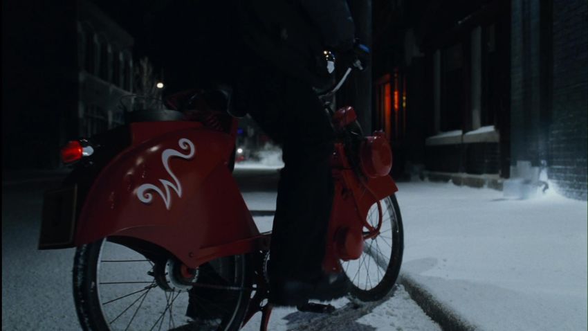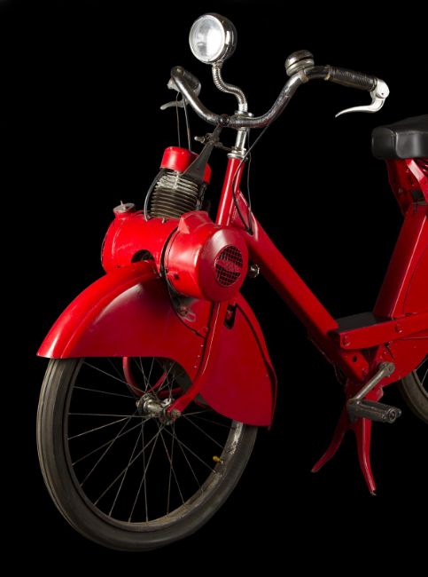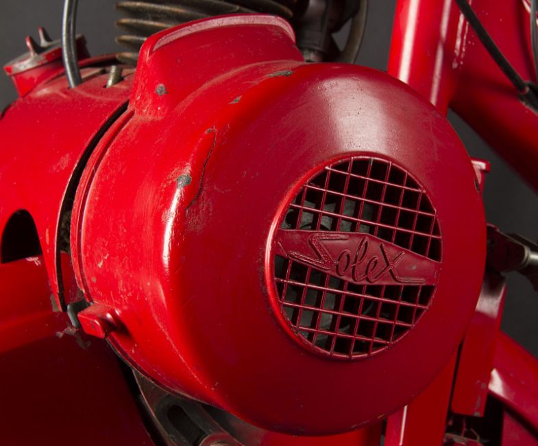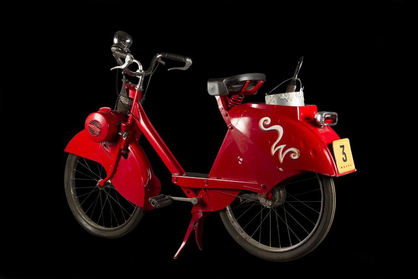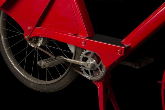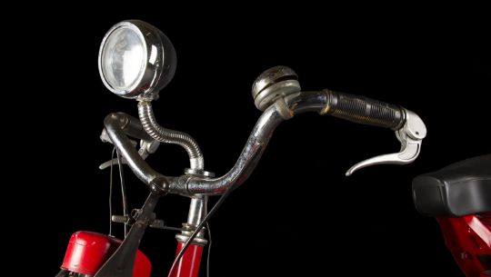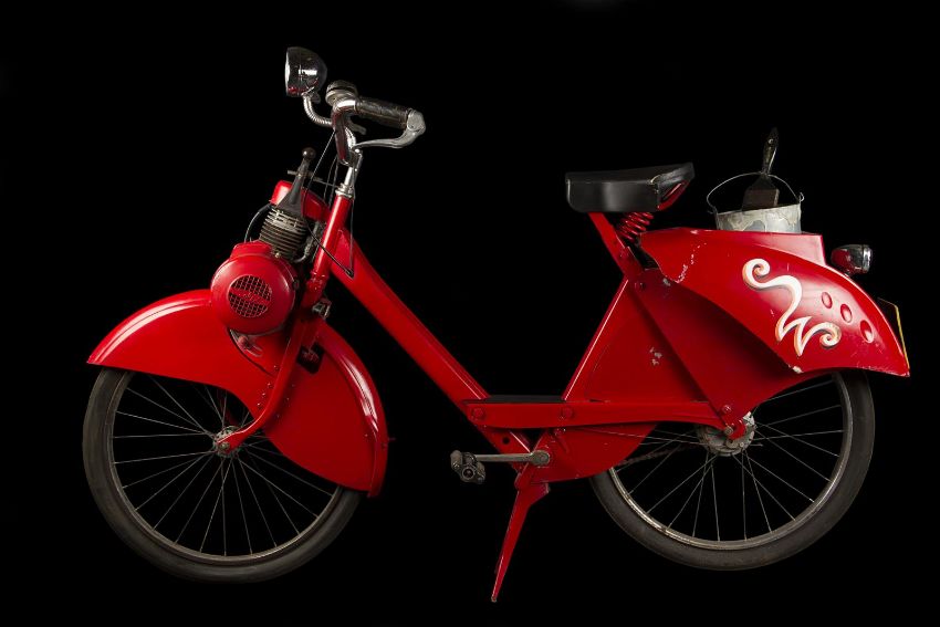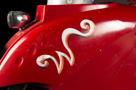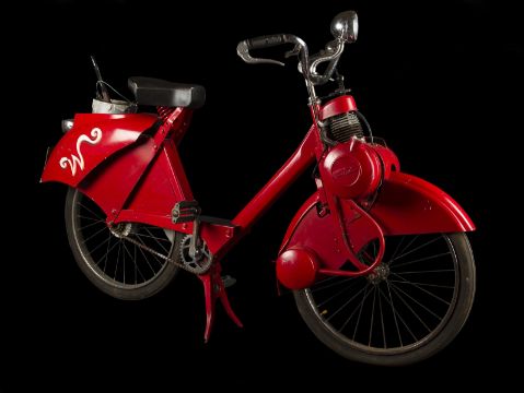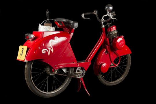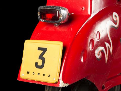 A Wonka factory bike from the fantastical adaption of Charlie and the Chocolate Factory directed by Tim Burton. Wonka factory workers rode bikes as they posted signs announcing Willy Wonka’s (Johnny Depp) contest allowing the finders of five Golden Tickets a tour of his legendary chocolate factory. Based on a modified VéloSoleX motorised bicycle, the bike displays a bright red frame and fender skirts, with a small two-stroke engine located at the front. The bike features a black leatherette seat and distinctive white Wonka 'W' vinyl decals located on either side of the back fender, with a small yellow Wonka-branded license plate reading '3' secured to the rear. A metal tin filled with resin to imitate the appearance of glue is secured to the top of the back fender, with a wooden paintbrush held within it. While the bike is in motion, the pedals operate a small motor which allows the glue tin to rotate in a circle. The left-side Wonka decal is coming away slightly from the fender, however overall the bike remains in good condition. Dimensions: 165 cm x 46 cm x 107 cm (65" x 18 ¼" x 42 ¼")This lot is supplied with a Warner Bros. certificate of authenticity in place of a Prop Store certificate. Payment plan on this item is restricted to a duration of one month. Please contact us for further information. The bike is sold in a static ‘rolling only’ condition and is drained of all fluids. As this item contains electronic components, every effort has been made to describe them accurately, however no guarantee or warranty is made as to the functionality or lifespan of those components. It is entirely incumbent on the new owner to satisfy themselves as to their use and maintenance. VAT Status - DAGGER