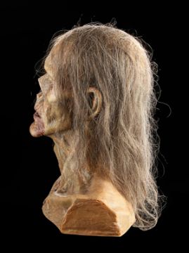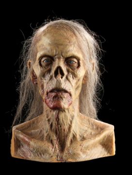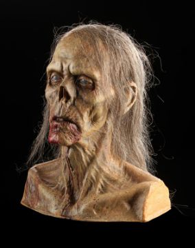 A zombie make-up test bust from George A. Romero’s zombie film Land of the Dead. The bust was created by special effects supervisor Greg Nicotero to design the makeup for the zombies seen throughout the undead-plagued city of Philadelphia. The desiccated bust is made of dense foam rubber and features accentuated cheek and nose features, and hand-punched hairs across the scalp. The piece is expertly hand painted in light flesh tones, with clouded blue eyes and faux blood down the chin, neck and shoulders. It displays some minor wear to the paint finish from production use. Dimensions: 25 cm x 28 cm x 36 cm (9 ¾" x 11" x 14 ¼") VAT Status - Margin