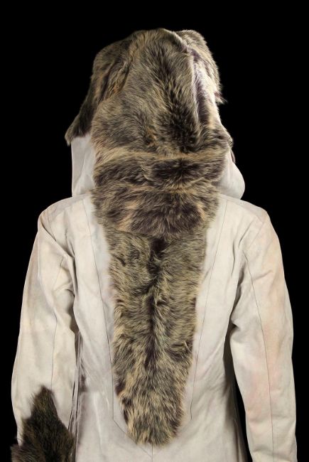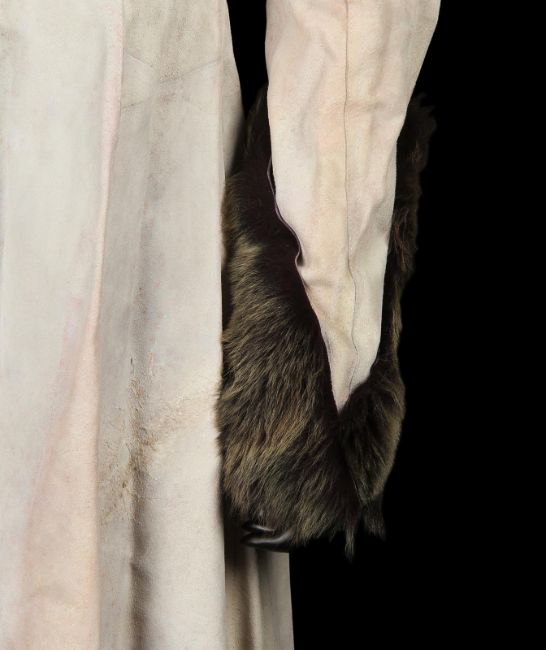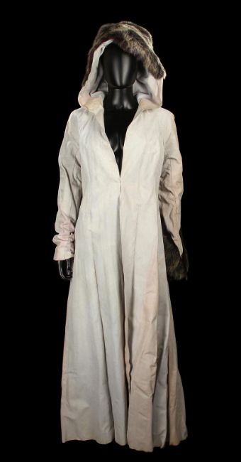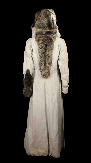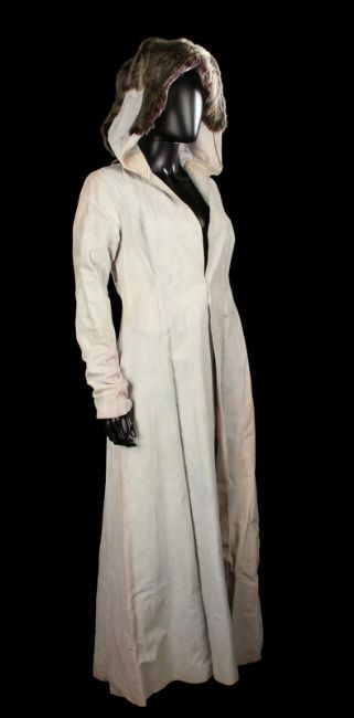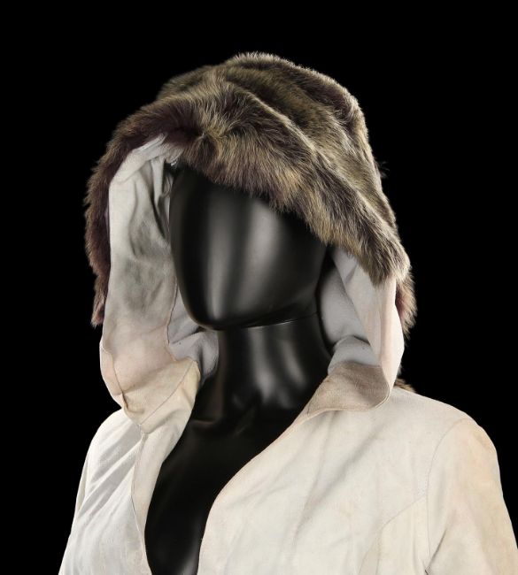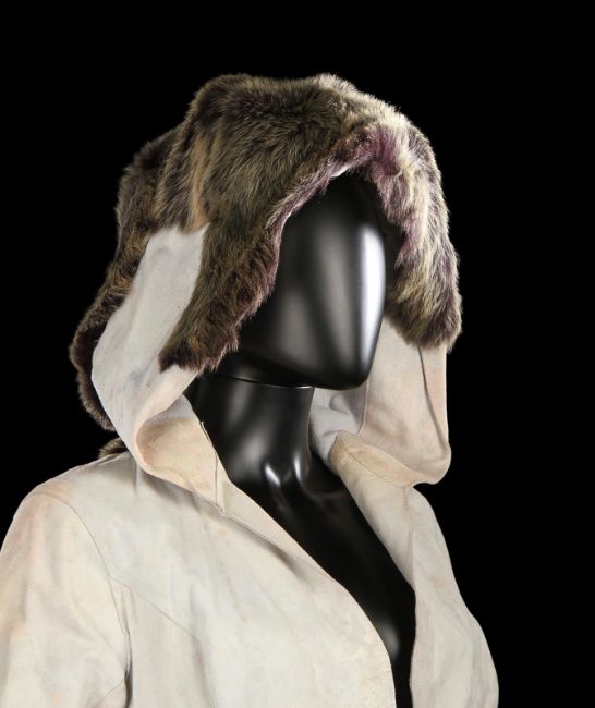 Lara Croft’s (Angelina Jolie) arctic coat from Simon West’s action-adventure Lara Croft: Tomb Raider. Croft wore her faux fur-trimmed coat on the trip to Siberia, accompanied by her faithful assistant Bryce (Noah Taylor) and rival Manfred Powell (Iain Glen), to uncover the remaining half of the Triangle of Light. Designed by renowned costume designer Lindy Hemming, this full-length custom-made hooded coat is made from pale grey suede and has a grey fleece lining. It features a faux fur hood that extends halfway down the back, and a matching faux fur cuff on the left sleeve. Signs of production use are evident throughout, including washed out pink stains and worn suede. VAT Status - Margin