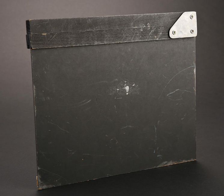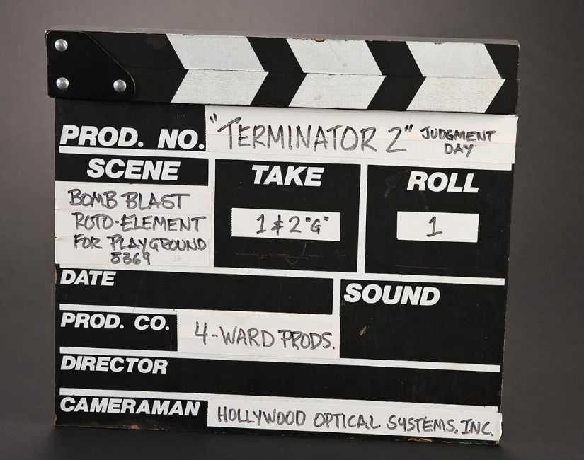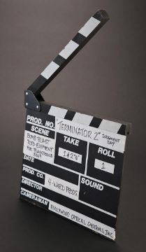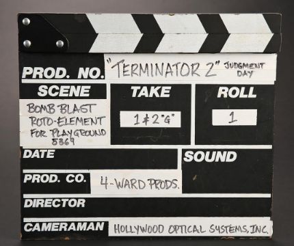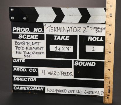 A visual effects clapperboard from James Cameron’s sci-fi action film Terminator 2: Judgment Day.This clapperboard is made of wood, with the slate categories painted with white lettering within white boxes. White tape is applied next to several boxes and indicates this particular clapperboard was used by special visual effects company,4-Ward Productions, during the classic playground scene when nuclear fire decimates Los Angeles. To achieve the look of nuclear devastation, 4-WardProductions constructed the Los Angeles cityscape using large scale miniatures and subsequently destroyed it using air mortars. The clapper stick is still firmly attached via metal hardware. Well-used and exhibiting natural production wear on the hinge and plate, the clapperboard remains in very good condition. Dimensions: 30 cm x 27 cm x 3 cm (12"x 10 ¾" x 1") VAT Status - OMEGA